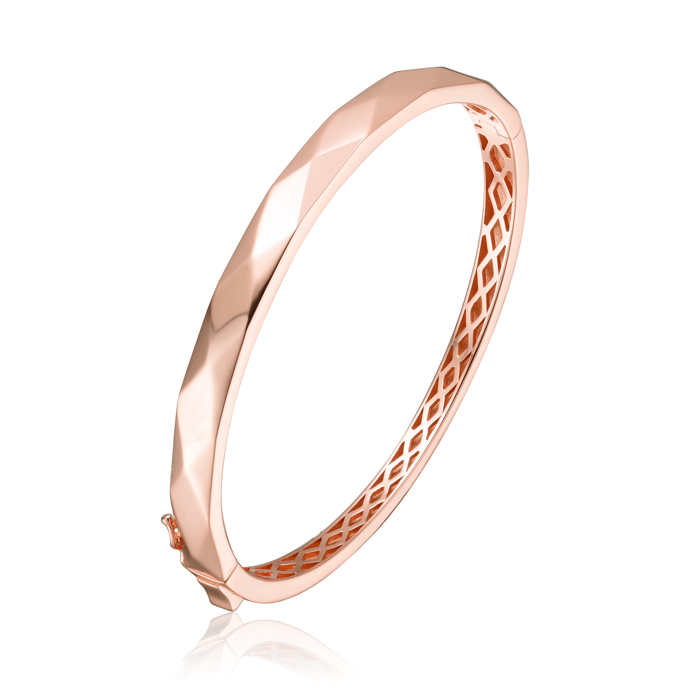 Classy Sterling Silver with Rose Gold Plating Bangle Bracelet. This bracelet features patterns on the surface of the metal, both on the inside and forepart areas. Crafted of .925 Sterling Silver, the jewelry is secured with an invisible clasp. This piece is perfect on a semi-formal dress.