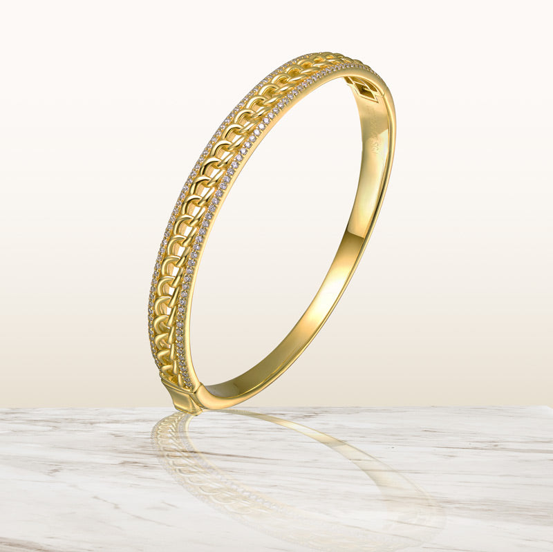Sterling Silver 14k Yellow Gold Plated with Cubic Zirconia Chain Link Stiff Bangle Bracelet. Add the perfect touch to your stacked bracelet collection by wearing this sterling silver 14k yellow gold plated bangle. Rails of round brilliant cut diamond-like cubic zirconias frame the exterior of this shiny bangle, creating a luxurious style. A dimensional chain link along the interior of the bangle lends texture, creating a highly accessorized style made to get noticed. A hinge and double safety closure keep it secure.