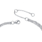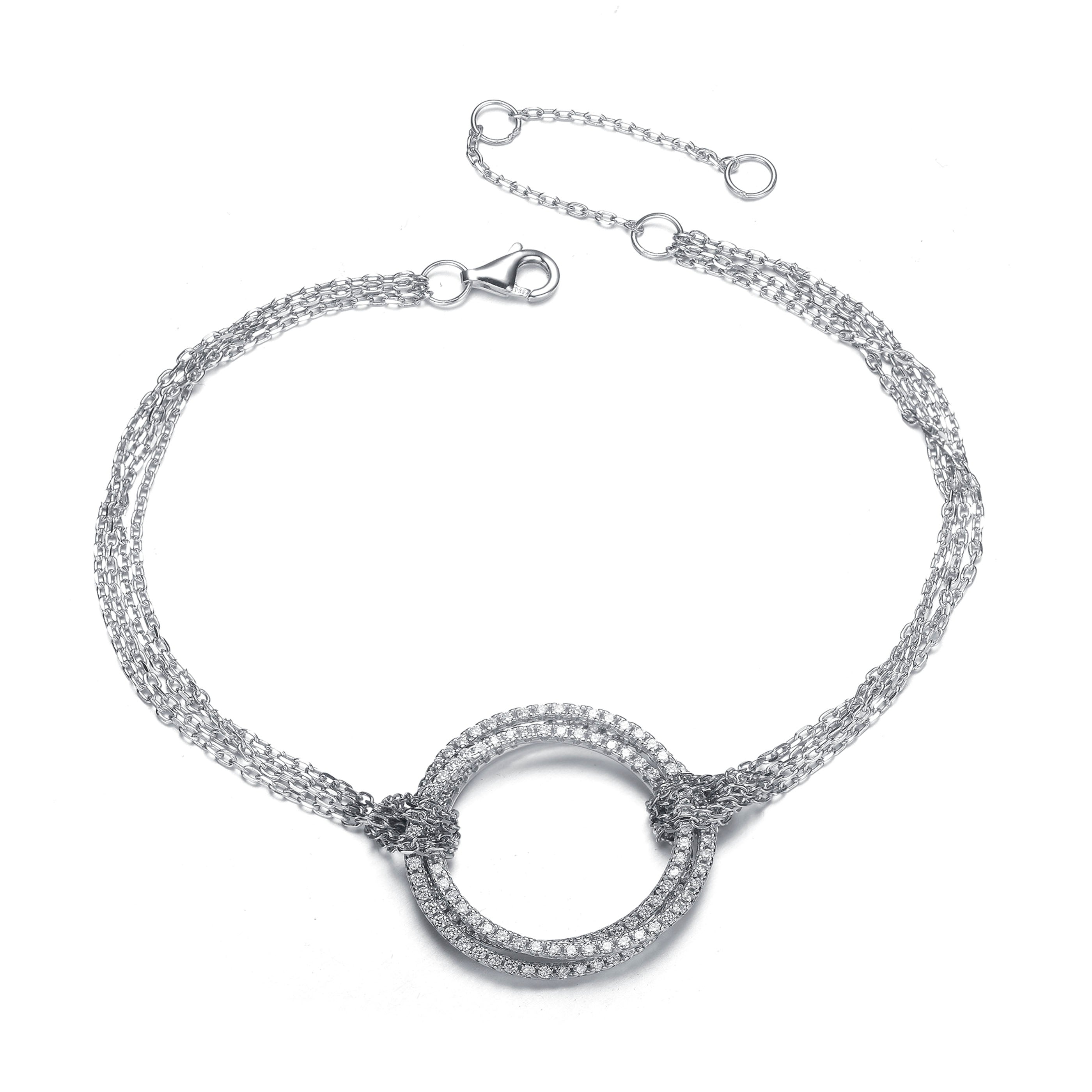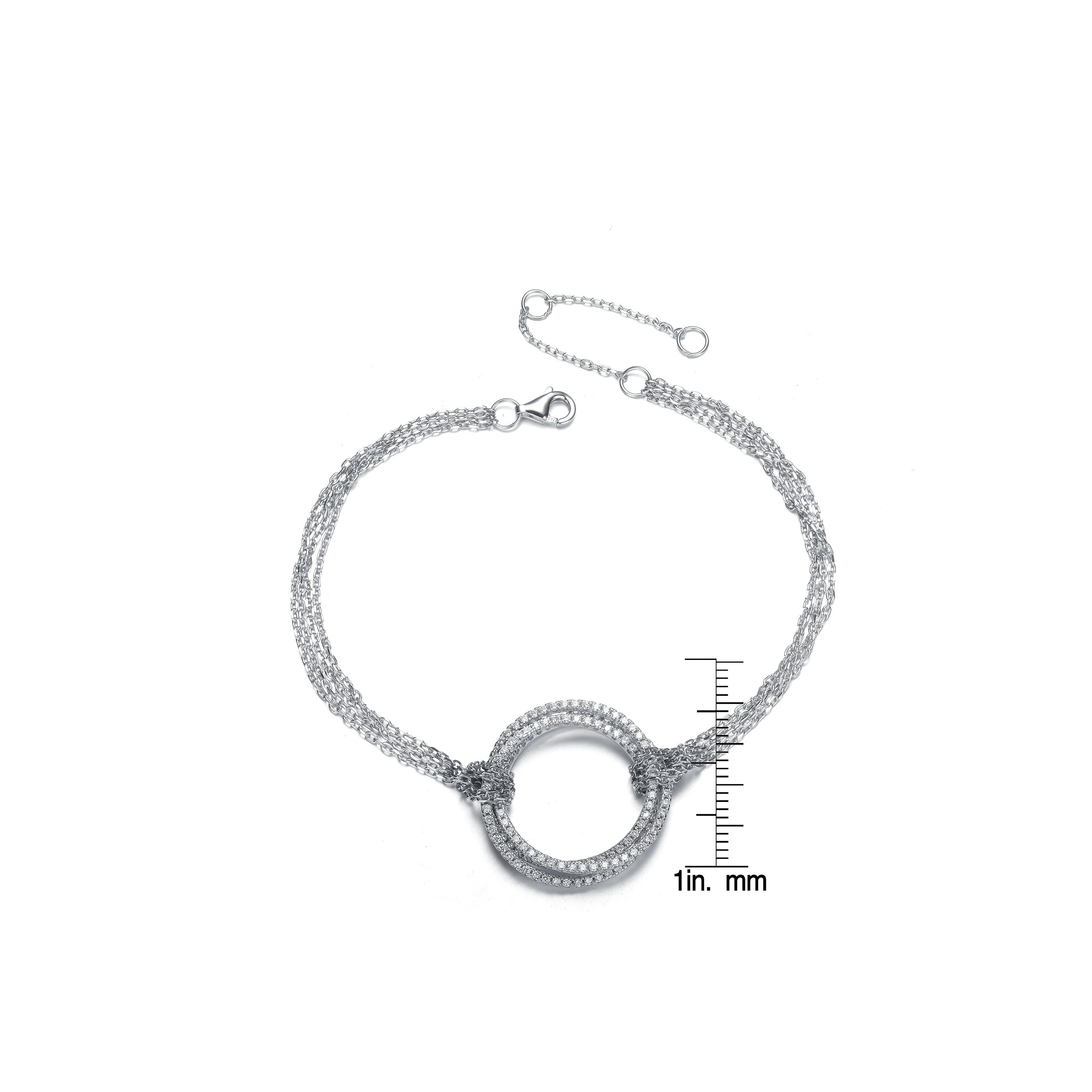 This impressive bracelet features several shimmering strands that make up the chain. In the center, there's a circular piece comprised silver chains, plus cubic zirconia stones.