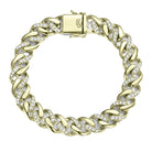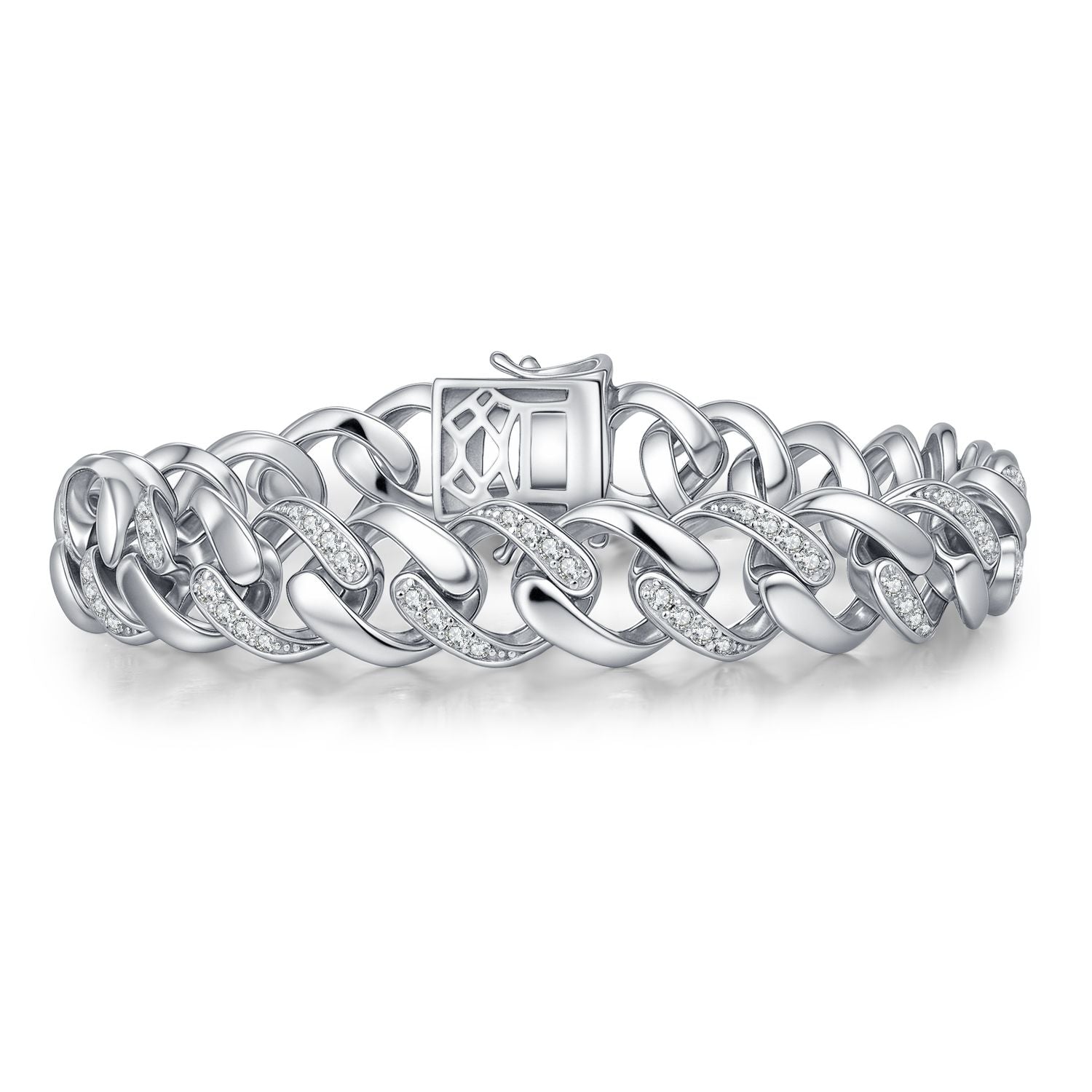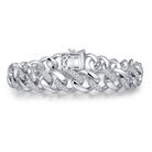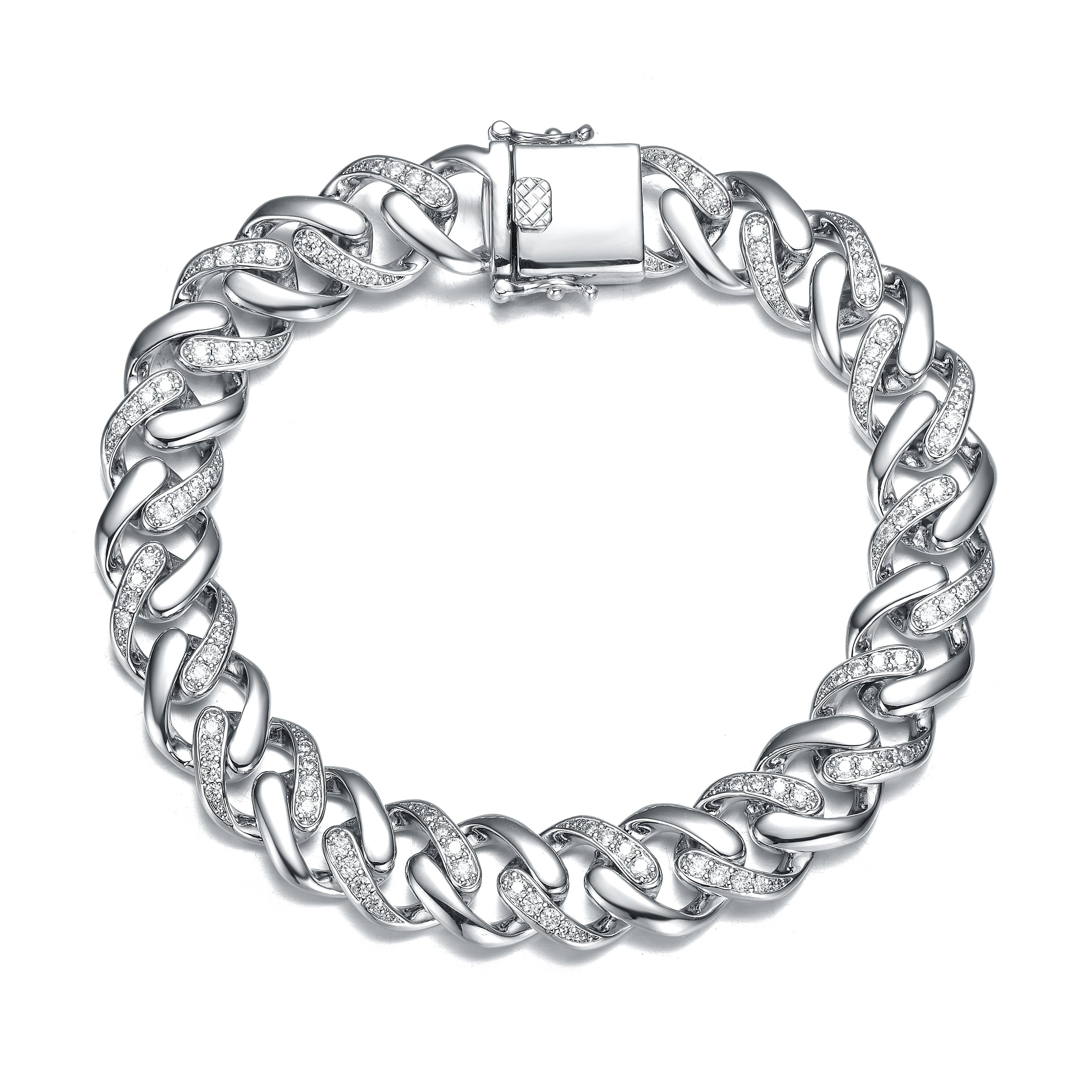 This striking curb chain bracelet features a high-polish finish and rows of round, diamond-like cubic zirconia set in elegant French pavé detailing throughout. A secure hidden box clasp with dual figure-eight safety closures ensures confident wear. Perfect on its own or paired with a favorite timepiece. Available in sterling silver with either Rhodium or Gold plating.