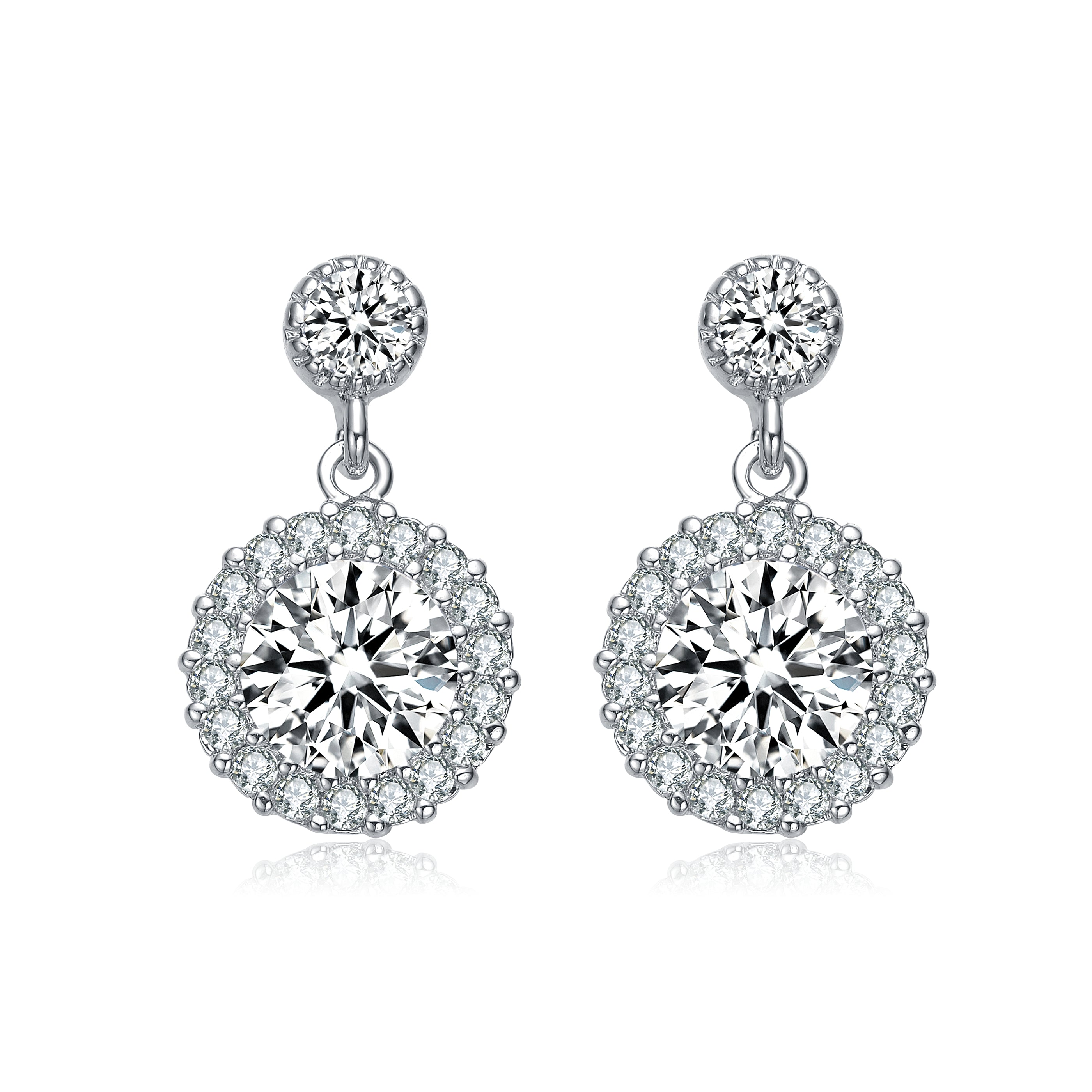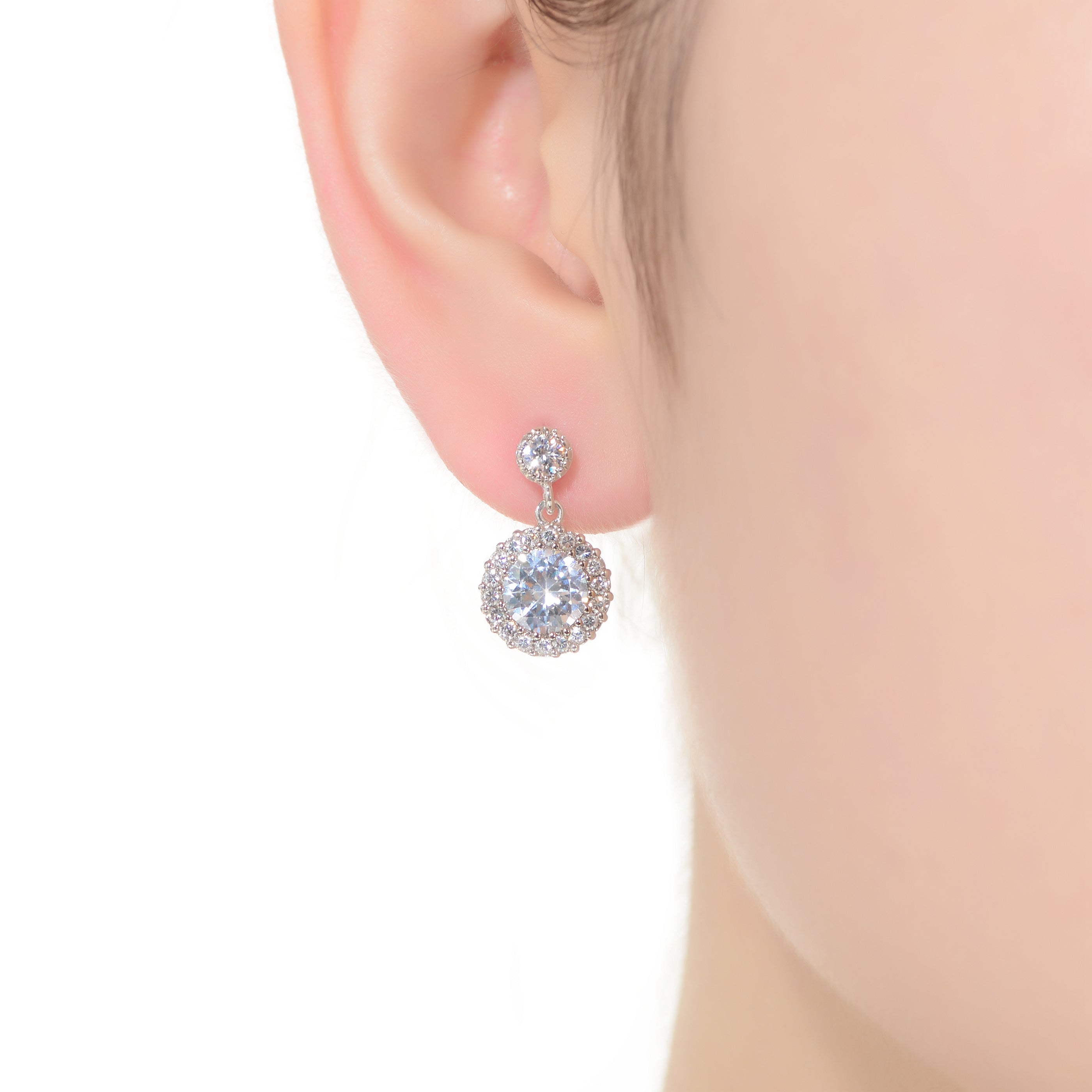 These beautiful drop earrings are decorated with dazzling clear round Cubic Zirconia accentuated with a halo of small clear round Cubic Zirconia. A solitaire of clear round Cubic Zirconia serves as the post. Crafted of Sterling silver with Rhodium plated the earrings secure with butterfly clasps.
