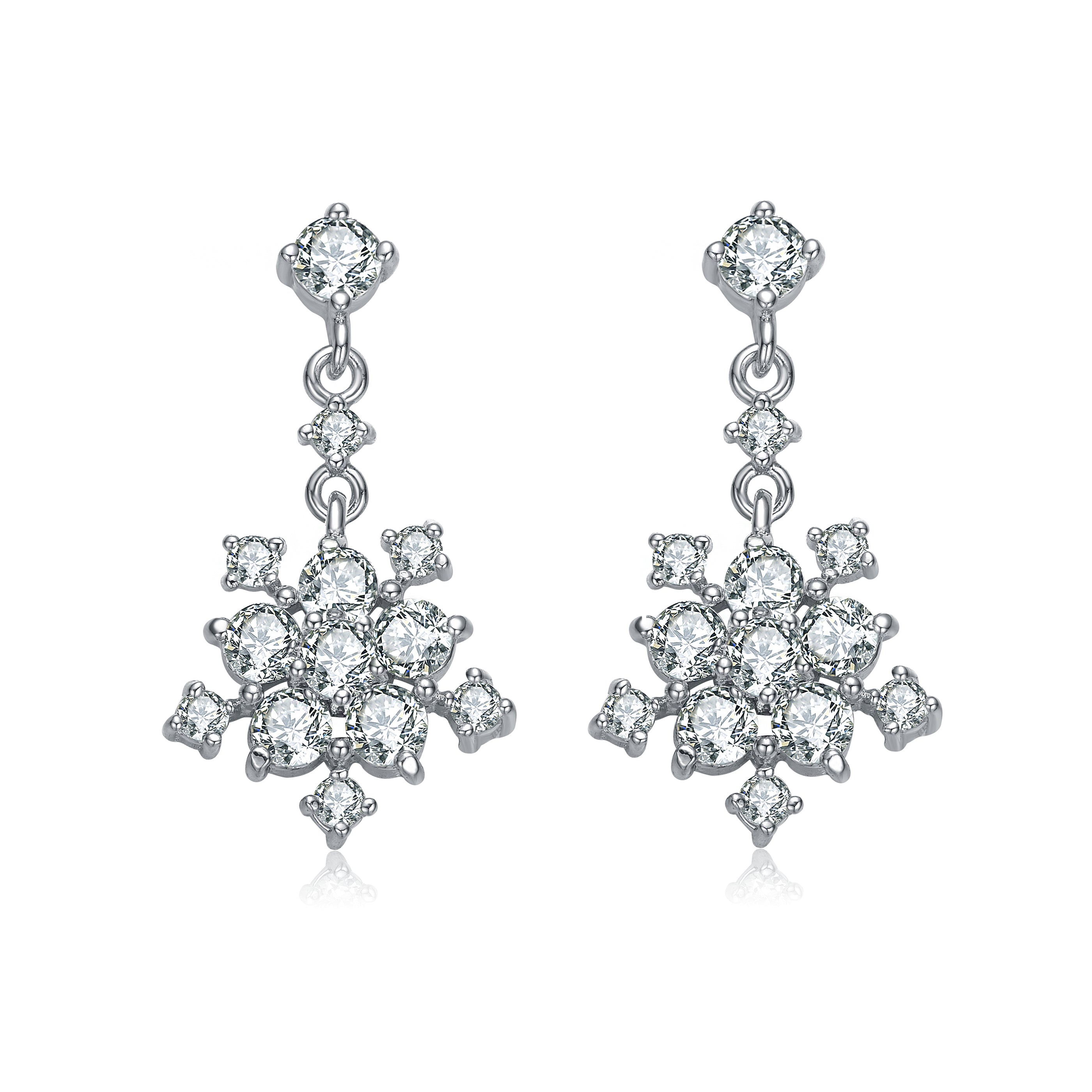 These gorgeous earrings feature a delicate flower drop design which is composed of a cluster of clear round Cubic Zirconia set in Sterling silver with Rhodium plated. The earrings post and trail are also accentuated with small clear round Cubic Zirconia. These earrings secure with butterfly clasp.
