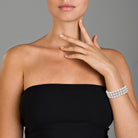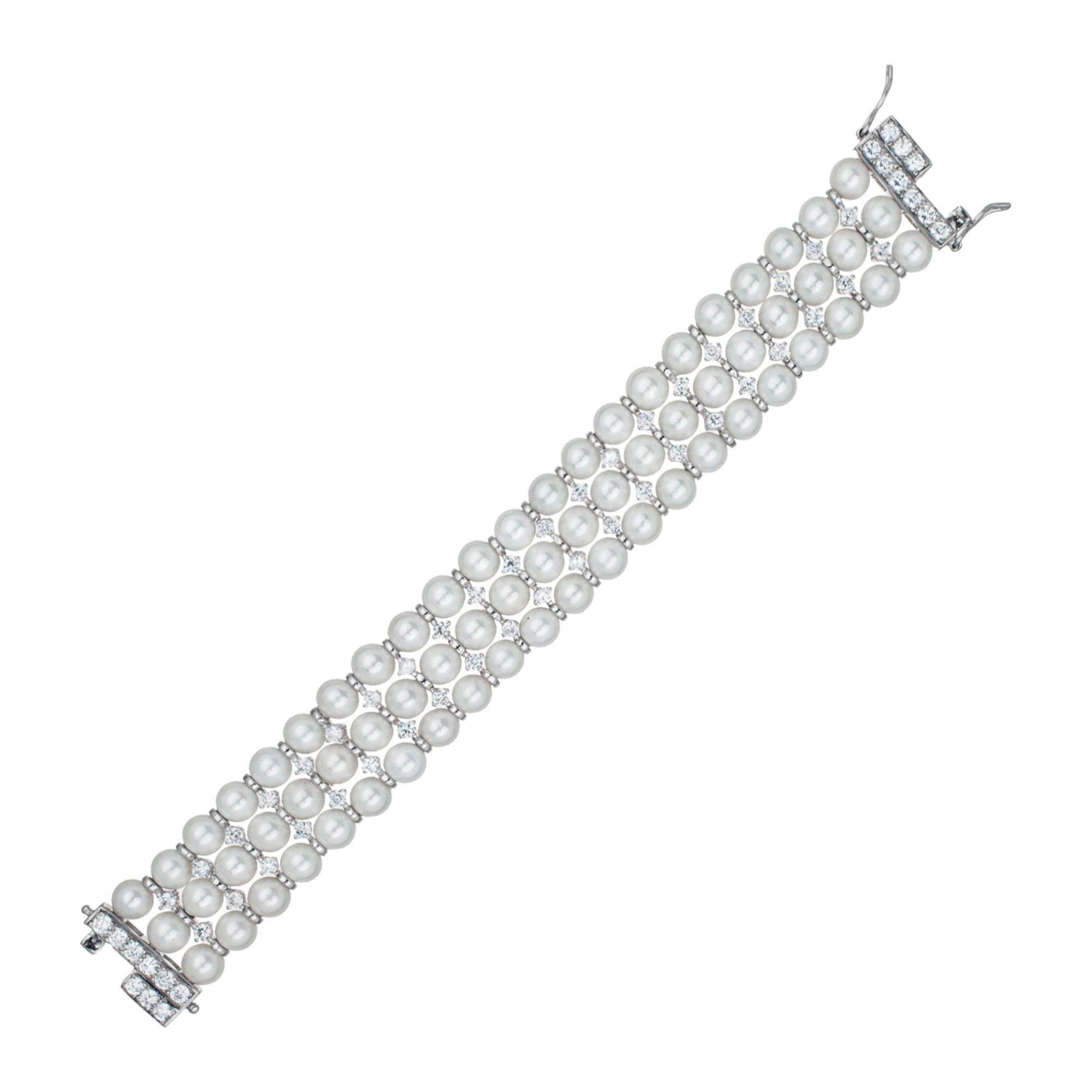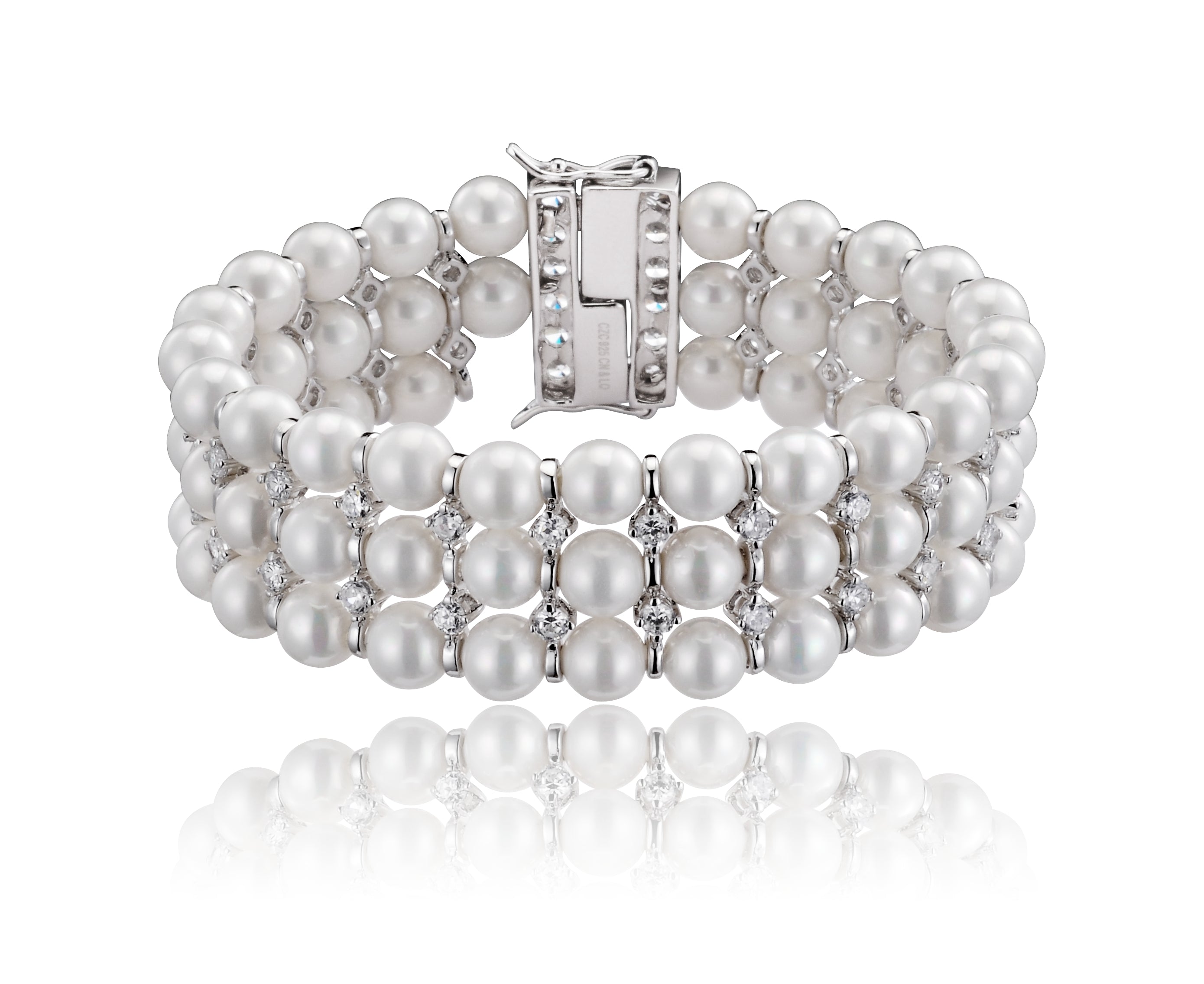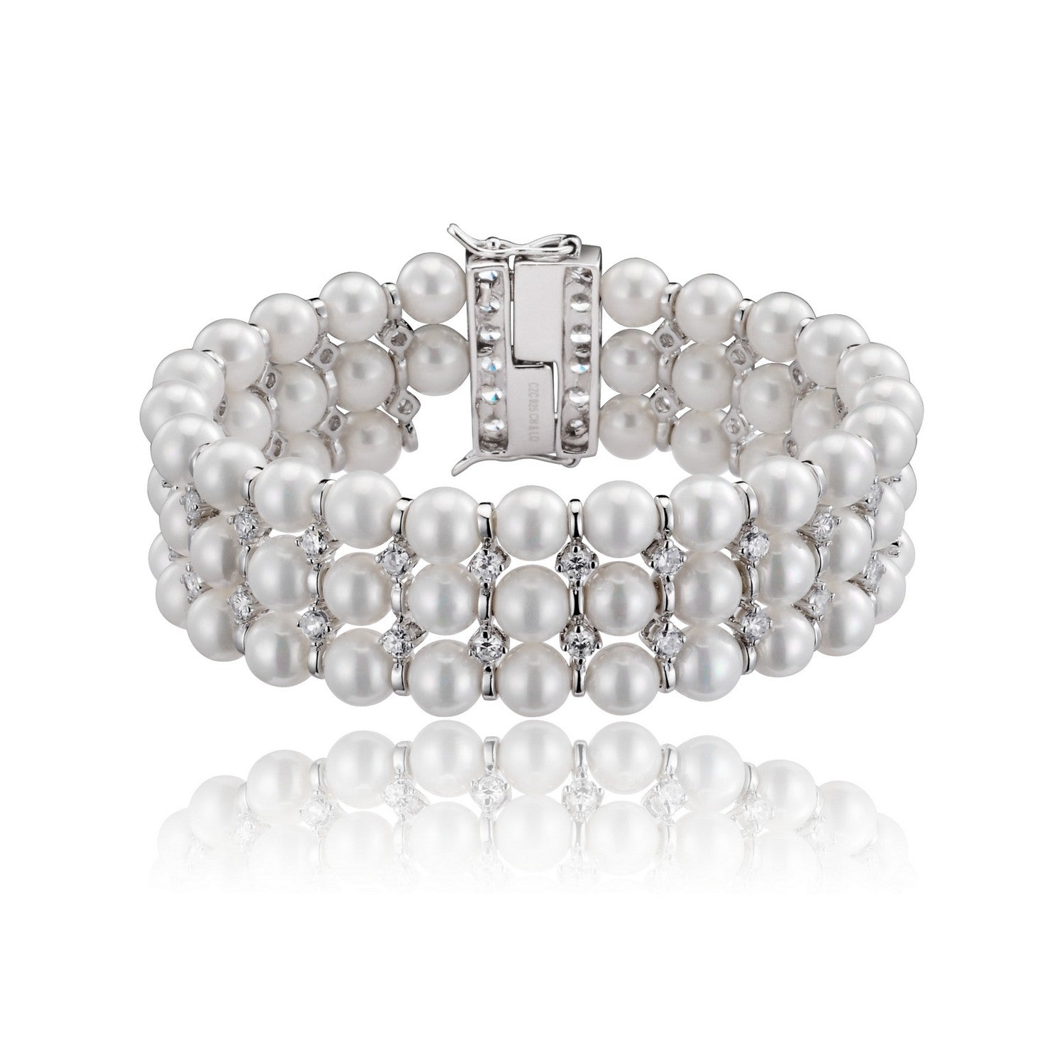 Elegant .925 Sterling silver cubic zirconia and pearl bracelet. This bracelet features pearls set in three rows with small clear round cubic zirconia stone between. Crafted of .925 Sterling silver and it is secured with box clasp. Available in two sizes 7 and 8 inch long