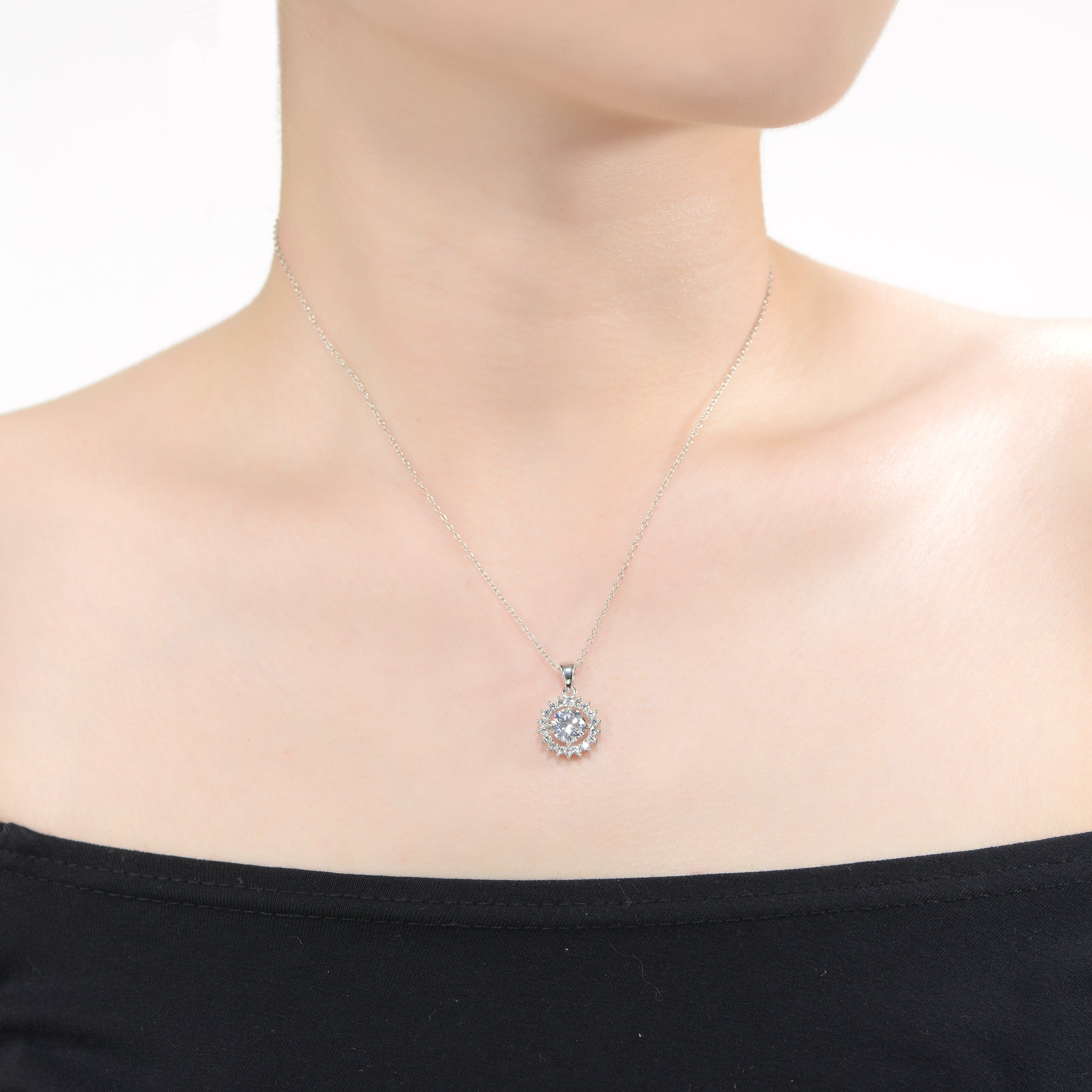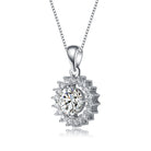 Fashionable and elegant flower pendant necklace. This flower shape designs features center of clear round cubic zirconia and smaller round cubic zirconia accents. This necklace is set in .925 Sterling silver with rhodium plated and has a spring ring closure.