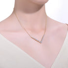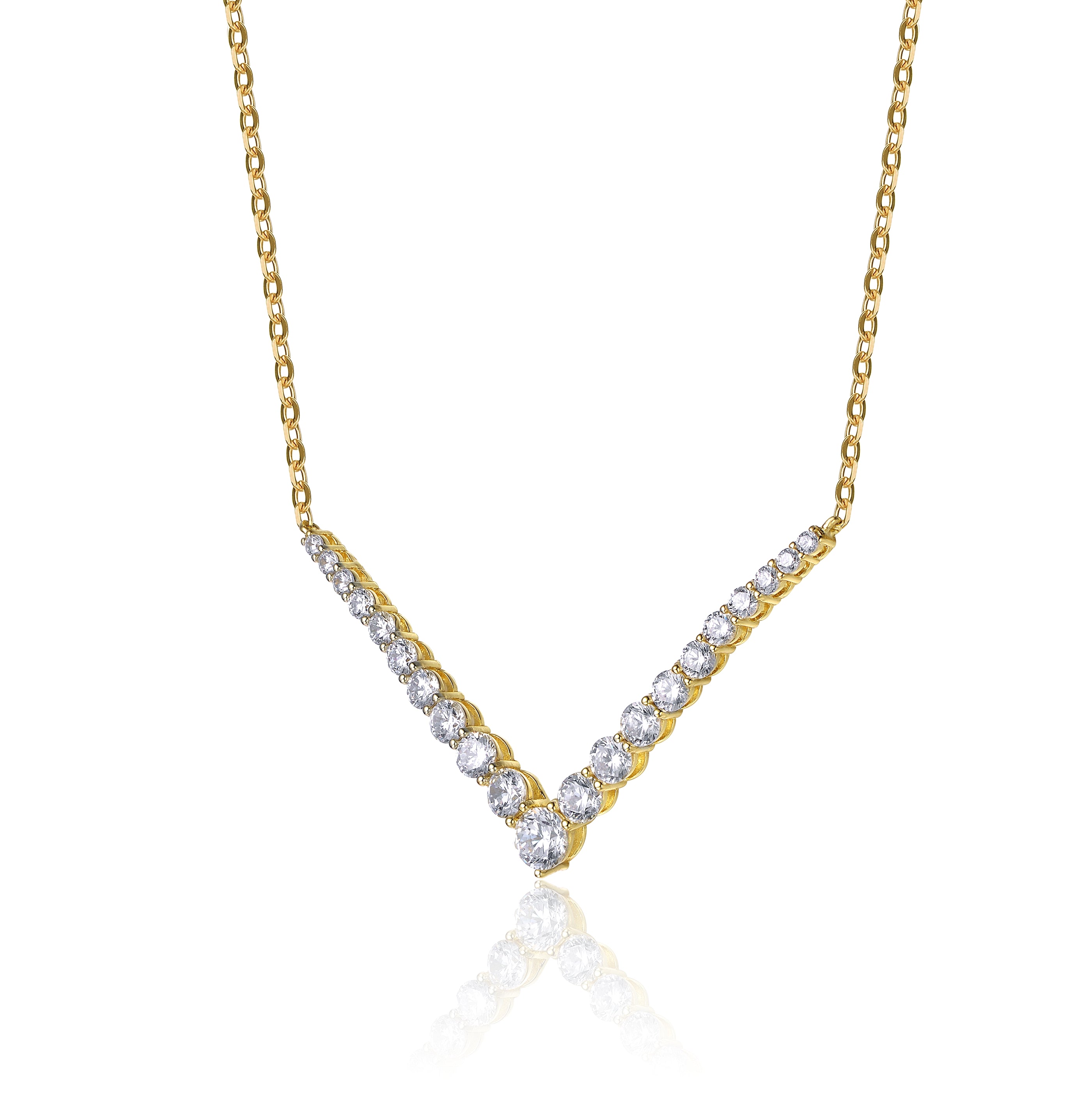A glittering cascade of round brilliant cut cubic zirconias are prong set in a dazzling cluster on this chevron pendant. A delicate cable chain and lobster clasp keep this chic layering necklace secure, all finely crafted in 14k yellow gold plated sterling silver. Available in different stone color options.