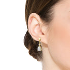 Add elegance to any outfit with these glamorous dangle earrings. Sparkling pear-shaped and round brilliant cut cubic zirconias are prong set in a 2-stone design. Raindrop designs on the top lend these pretty earrings a vintage appeal, all finely crafted in 14k gold plated sterling silver. Butterfly backs keep them secure.