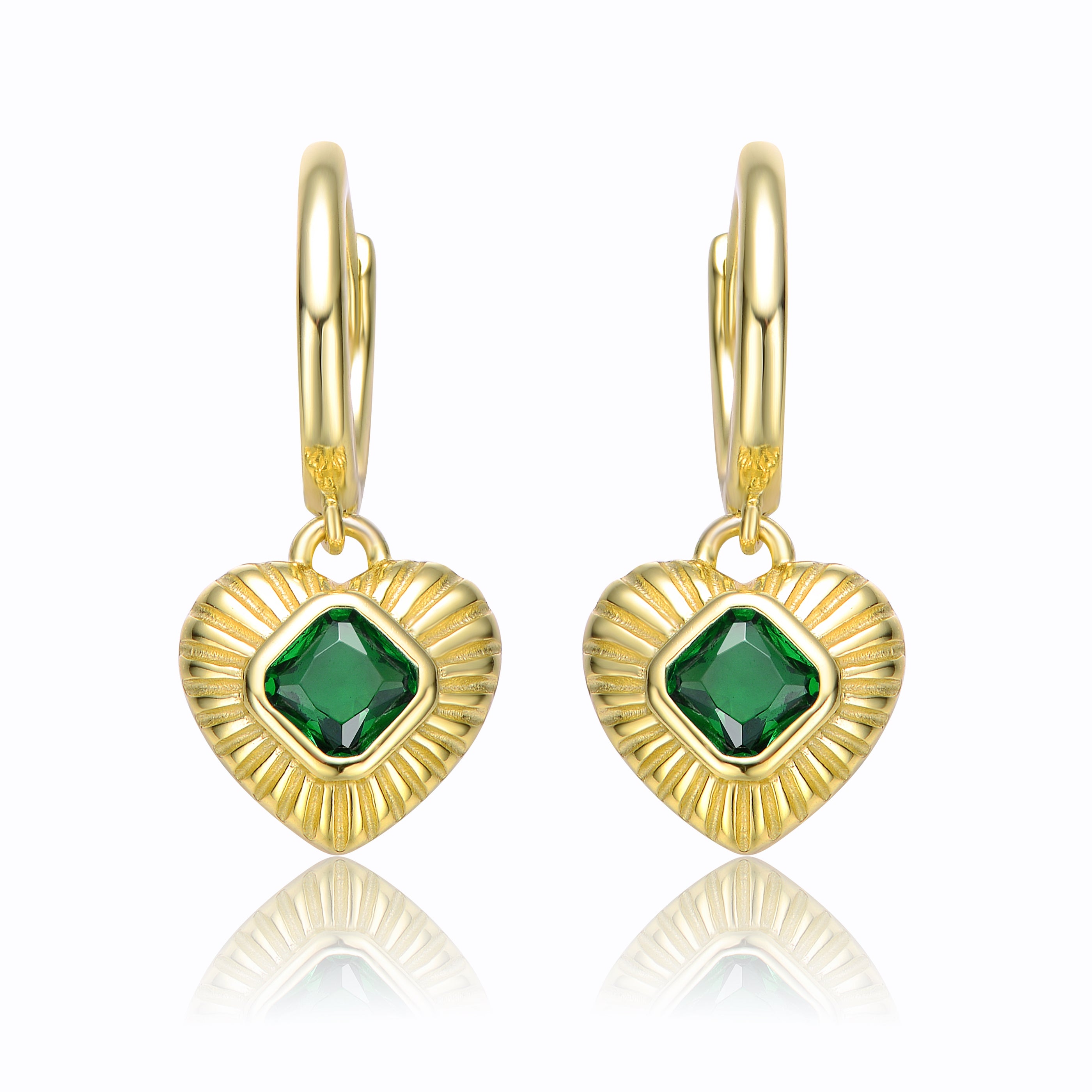 Sterling Silver 14k Yellow Gold Plated with Emerald Cubic Zirconias Dangle Heart Huggie Hoop Earrings.Upgrade your look with these adorable sterling silver 14k yellow gold plated dangle hoop earrings, finely crafted in a rich shine. Square cut deep forest green emerald-like cubic zirconias bezel set in the middle of textured sunrays evokes nature's beauty, completed by the elegant romance of hearts. Round tubular huggie hoops with curved posts create an infinity fit, sitting close to the earlobes when worn.