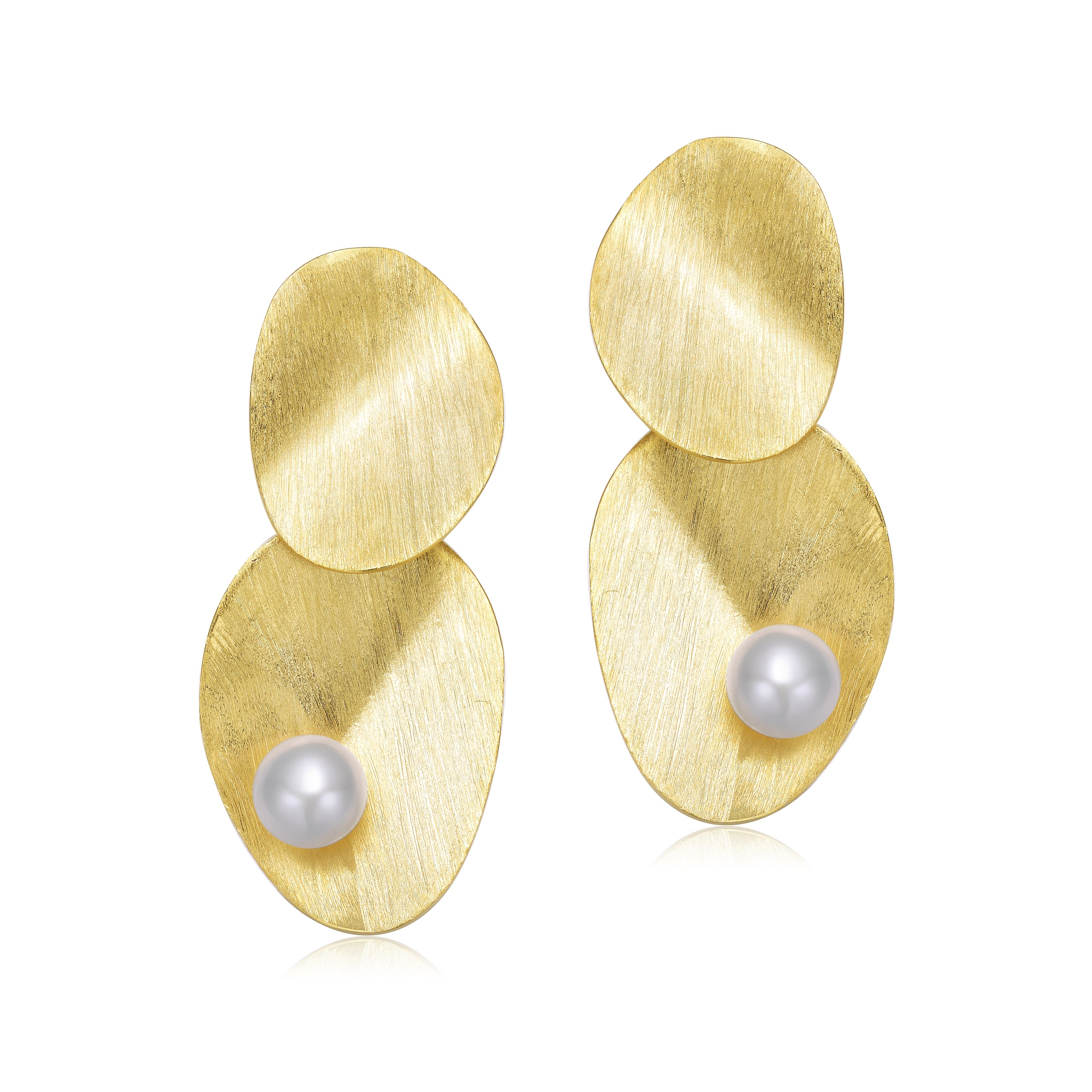 Very Unique Sterling Silver Gold Plated with Freshwater Pearl Earrings. These earrings feature two curvy gold metal frames. The round Freshwater pearl is set on the bottom curvy gold metal frame. Crafted in Sterling Silver with Gold Plating. This item is great adition to any outfit. Makes a great gift as well.