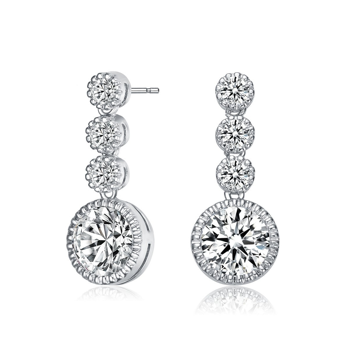 Featuring a linear style of clear round cubic zirconia with the large round stone used as the earrings drop and set in .925 Sterling silver with rhodium plated these earring are the perfect piece you can use to enhance your fashion. These earrings are simple yet classy so you will never go wrong even when pairing these with any outfit. this pair of earrings uses a butterfly clasp for a secure lock.