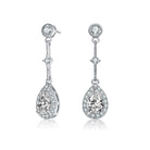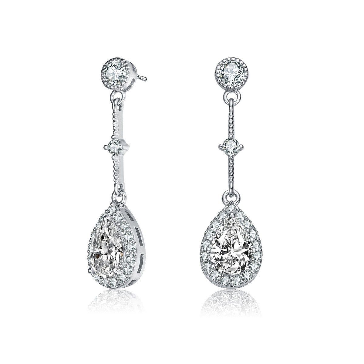 These stunning chandelier earrings are a perfect piece you can add to your jewelry collection. These earrings feature sparkling clear pear cubic zirconia accentuated with clear round cubic zirconia set in .925 Sterling silver with rhodium plated. A milgrain bezel is also used to hold the clear round cubic zirconia earrings post. These earrings secure with butterfly clasp.