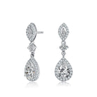 Gorgeous drop earrings feature a haloed clear pear cubic zirconia hanging below a clear round cubic zirconia which is connected with a clear marquise cubic zirconia post that is also haloed with small clear round cubic zirconia. These earrings are set in .925 Sterling silver with rhodium plated and secures with butterfly clasp.