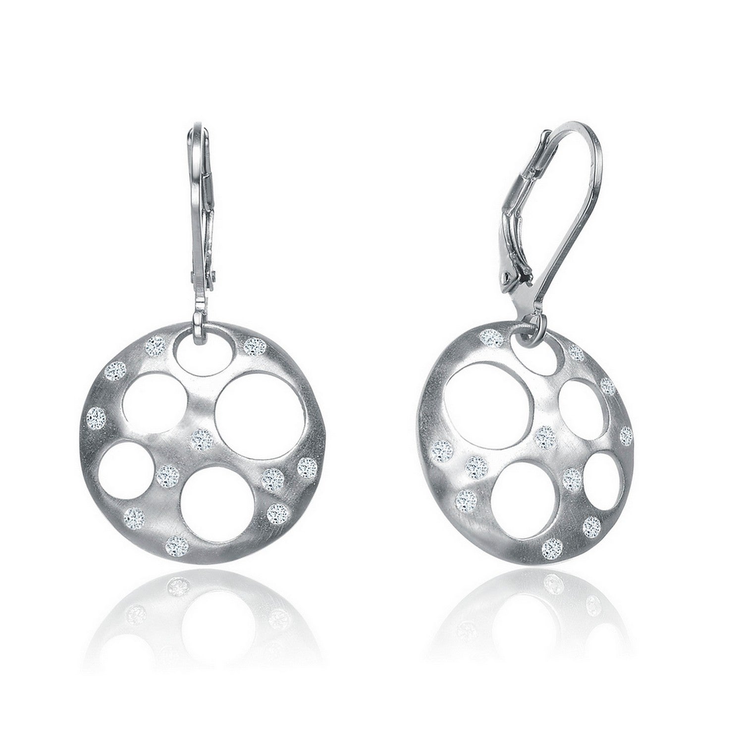 Stylish .925 Sterling silver cubic zirconia bubble brushed earrings. These stunning earrings feature clear round cut cubic zirconia stones with a Modern bubble design. Crafted of .925 Sterling silver the earrings secure with lever back closure.