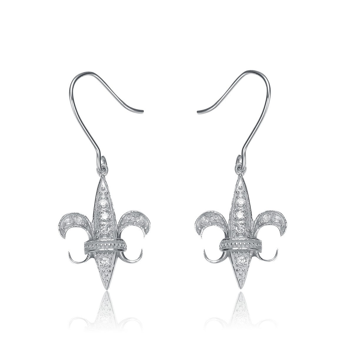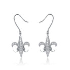 Stylish .925 Sterling silver cubic zirconia fleur de lis drop earrings. These fleur de lis earrings are the touch of glamour and feature round clear cubic zirconia stones paved on the metal frame. Crafted of .925 Sterling silver with rhodium plating and secure with a hook.