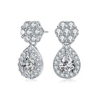 These pretty drop earrings feature a large drop of clear pear cubic zirconia with a halo of clear round cubic zirconia. The earrings post is a cluster of clear round cubic zirconia that forms a flower. Crafted of .925 Sterling silver with rhodium plated these earrings are secure with butterfly clasp.