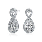 Dazzle and delight with these gorgeous infinity style drop earrings. These features a large clear pear cubic zirconia in the center of the studded infinity designed .925 Sterling silver with rhodium plated earrings. These earrings secure with a butterfly clasp to keep you at ease every time you wear them.