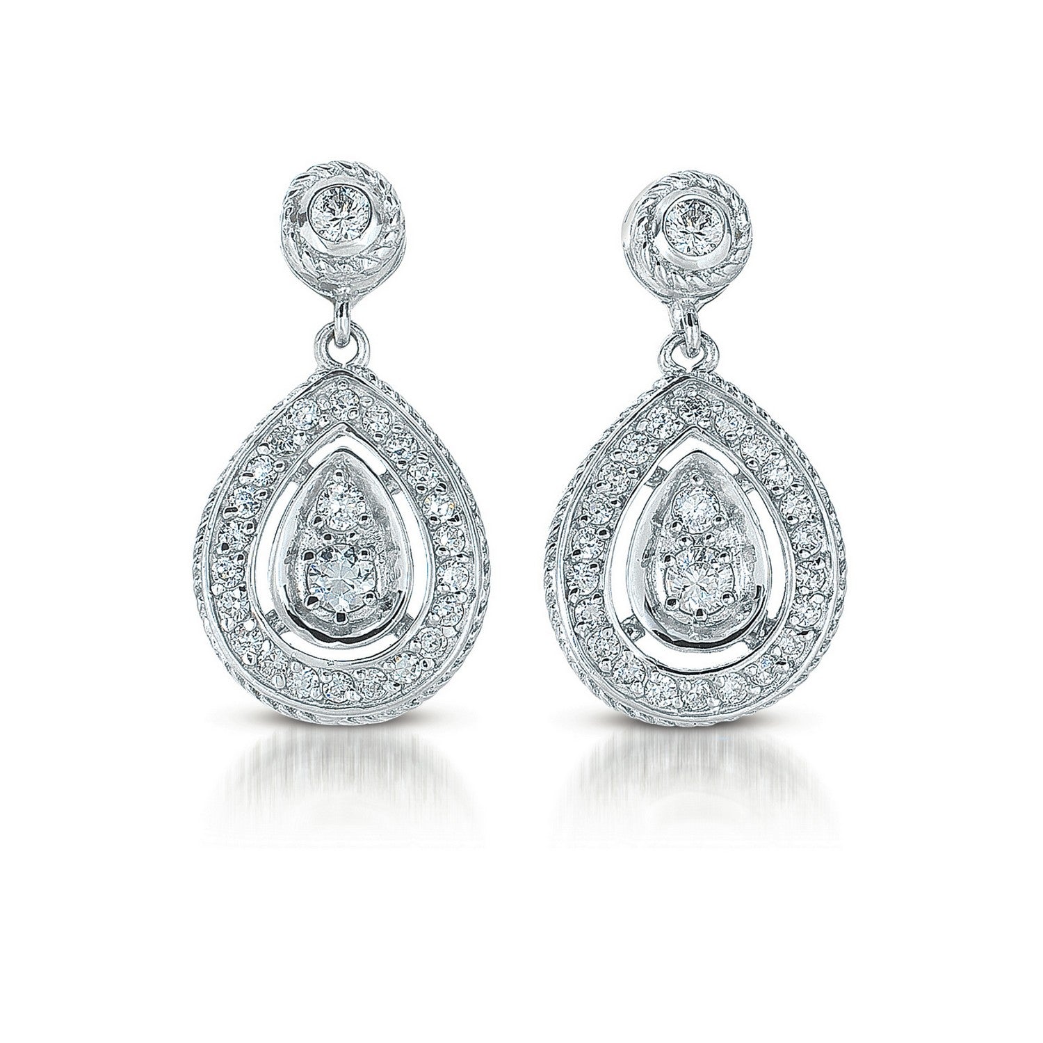 Stylish .925 Sterling silver cubic zirconia pear dangling earrings. Sparkling round clear cubic zirconia adorn the pear shapes of these drop earrings. Crafted of .925 Sterling silver in rhodium plating and secure with butterfly clasp.