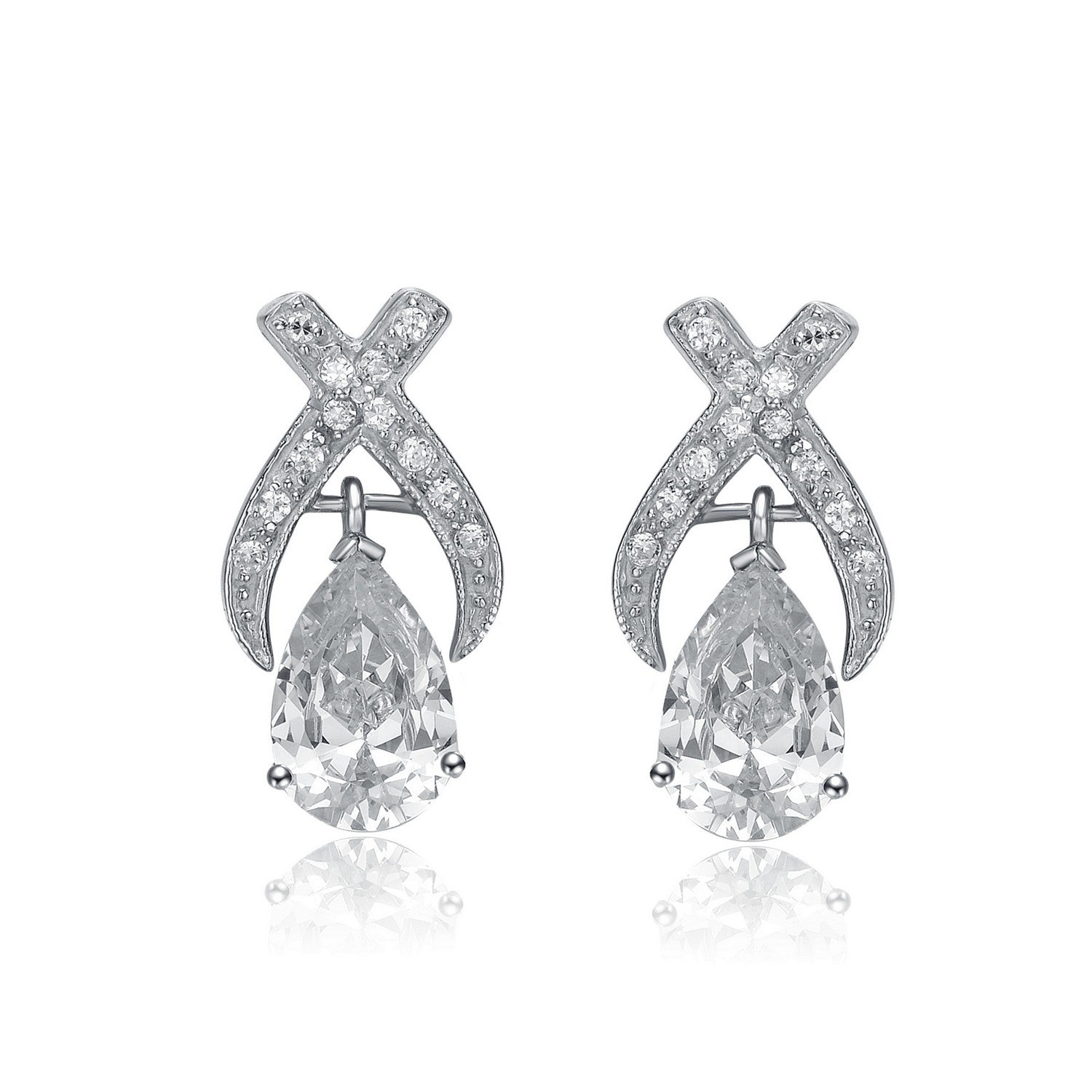 Stylish .925 Sterling silver cubic zirconia pear stud earrings. These feature a pear cut cubic zirconia dangle below a shimmering 'x' design paved with clear round cubic zirconia stones. Crafted of .925 Sterling silver with rhodium plating and secure with a butterfly closure.