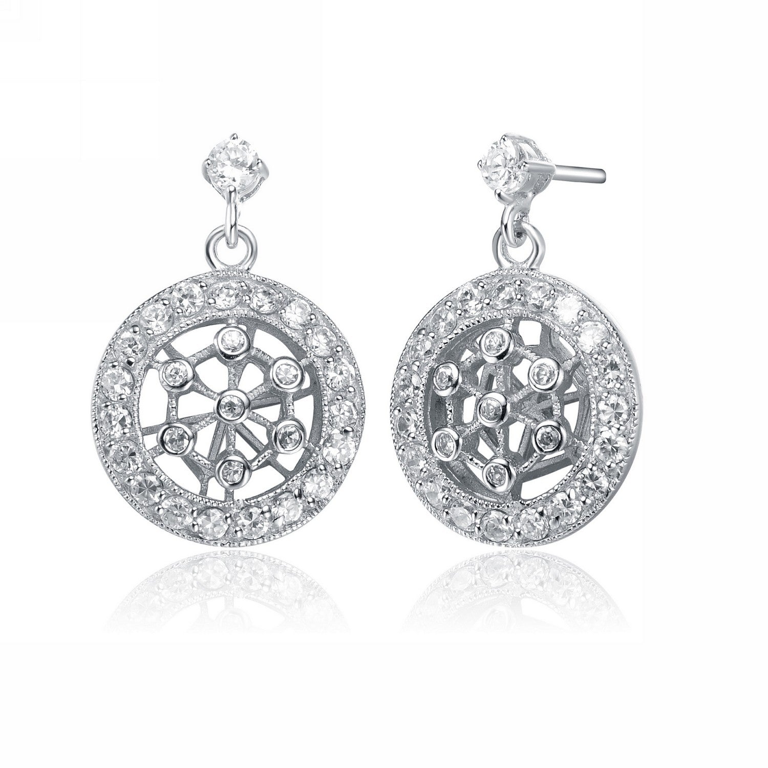 Stylish .925 Sterling silver cubic zirconia round drop earrings. These earrings features a circular drop with bezel set clear cubic zirconia in an openwork lattice design and milgrain border. Crafted of .925 Sterling silver with rhodium plating and secure with a butterfly closure.