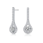 These fine dangling earrings feature a clear round cubic zirconia solitaire outlined with smaller cubic zirconia in these teardrop frame earrings. Crafted of .925 Sterling silver with rhodium plated the earrings secure with butterfly clasps.