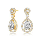 Class and elegance can be seen on these drop earrings. These feature a large pear cubic zirconia haloed with round cubic zirconia hanging below a haloed post of small round cubic zirconia. these earrings are set in .925 Sterling silver with 14K Gold plated and secure with butterfly clasp.
