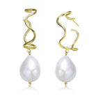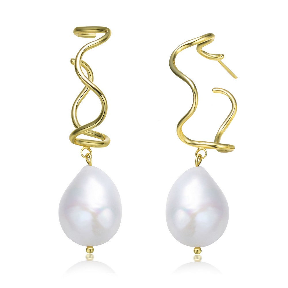 Very stylish .925 Sterling silver with gold plating and freshwater pearl curvy hoop earrings. This special set of earrings features unique curvy dangling hoops with freshwater pearls in it. Crafted in .925 Sterling silver the jewelry is secured with a butterfly clasp. These are perfect for semi formal dresses.