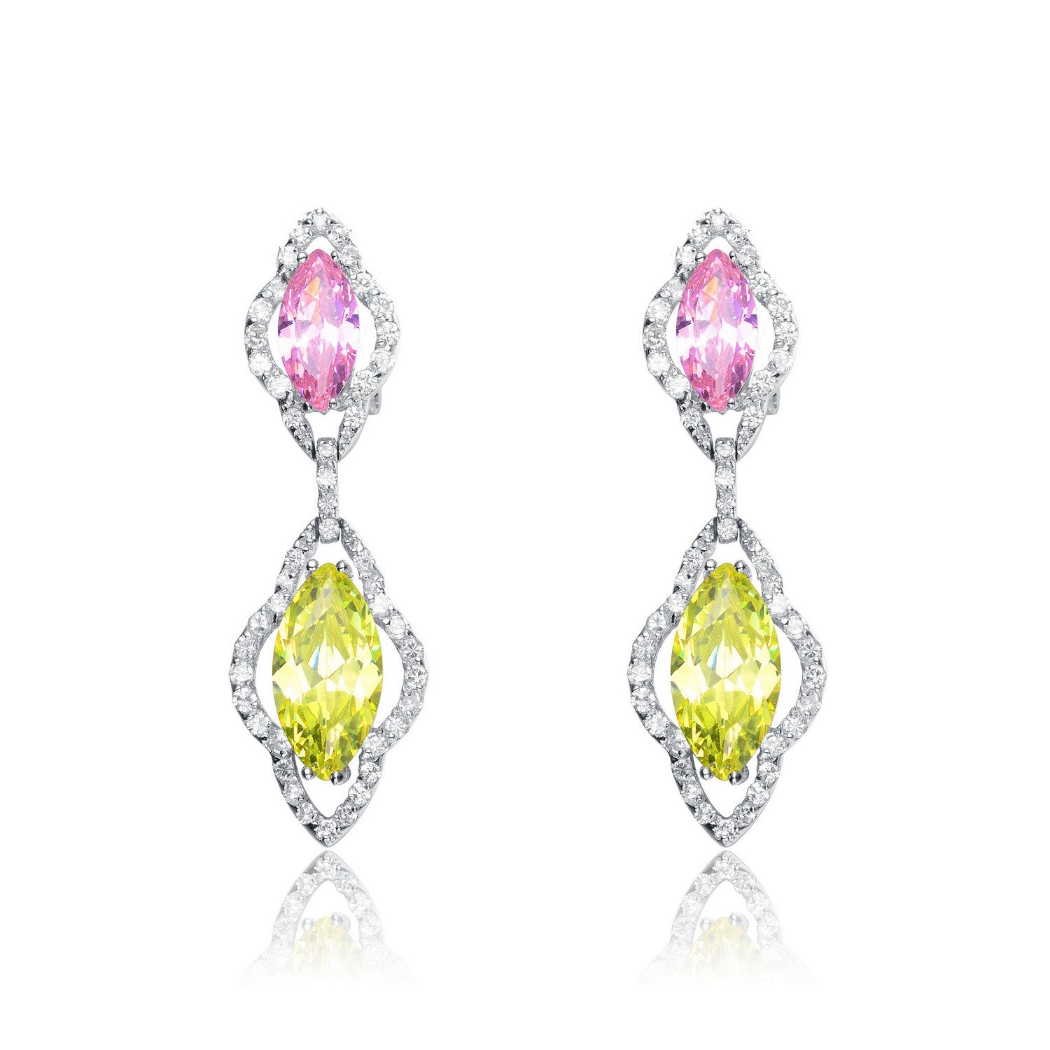 Stylish .925 Sterling silver rhodium plated cubic zirconia drop earrings. These earrings are decorated with dazzling pink and yellow marquise cubic zirconia stones and accented by small clear round cubic zirconia stones set on the metal frame. Crafted of .925 Sterling silver with rhodium plating and secure with omega clasps.