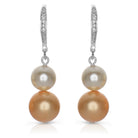 Stylish .925 Sterling silver multi colored pearl and cubic zirconia drop earrings. These earrings feature a white pearl and a bronze pearl stacked on each other accented by small clear round cubic zirconia stones set on the front of the lever back. Crafted in .925 Sterling silver with rhodium plating and secure with a lever back.