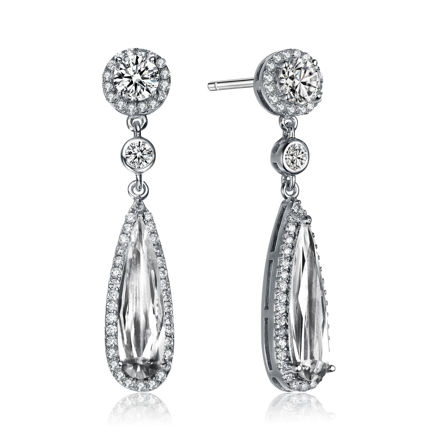 Stylish .925 Sterling silver multi shaped cubic zirconia teardrop earrings. These elegant pear shape dangling earrings feature dazzling clear round and pear cubic zirconia stones. The center stone is set in prong setting in the center of the silver frame accented by smaller clear round cubic zirconia stones. Crafted of .925 Sterling silver with rhodium plating and secure with butterfly closure.