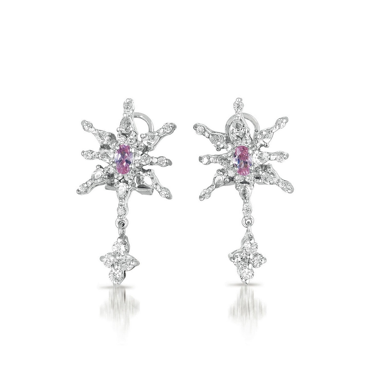 Stylish .925 Sterling silver purple cubic zirconia star drop earrings. Add some sparkle to any outfit with these star blast earrings that feature a simple pink stone each set features bright sparkling clear cubic zirconia stones that delicately dangle. Crafted of .925 Sterling silver with rhodium plating and secure with butterfly closure.