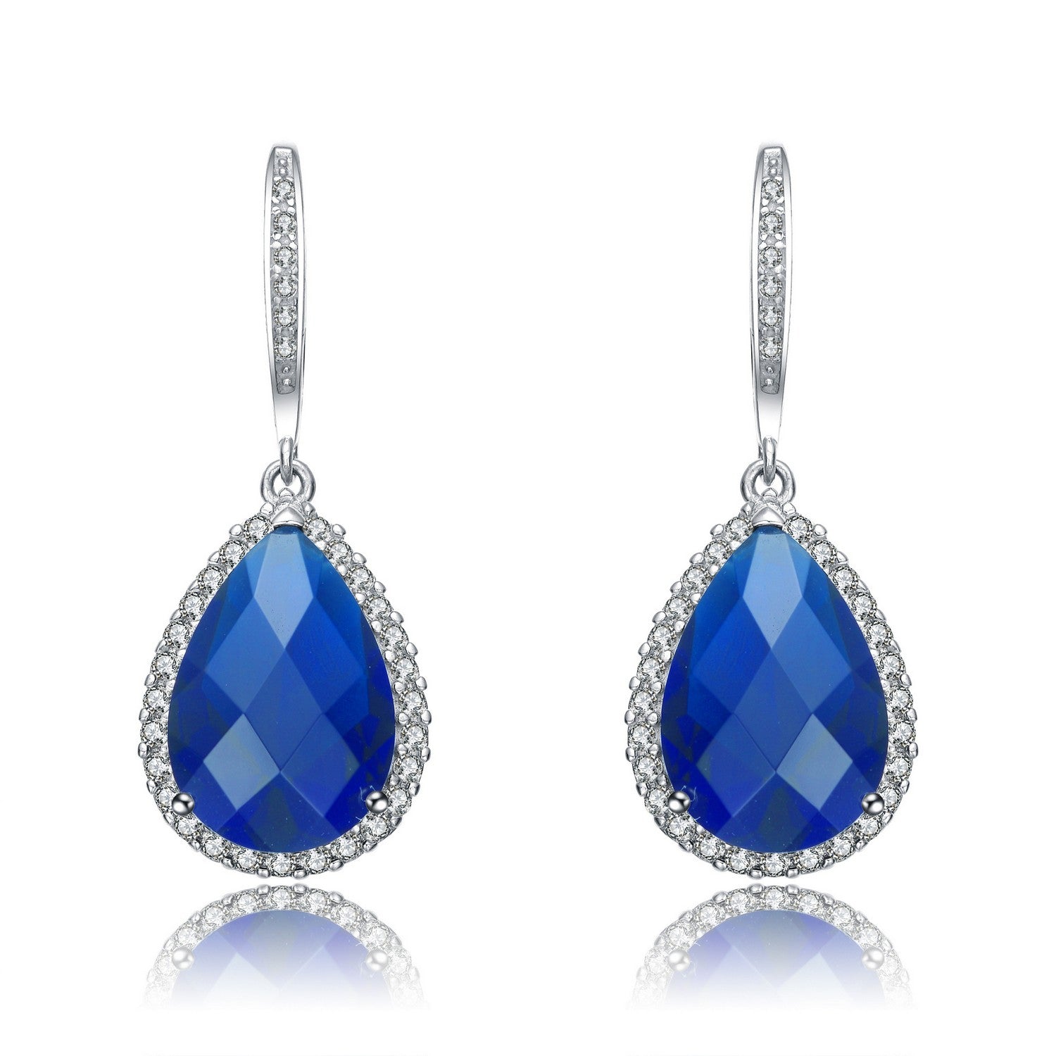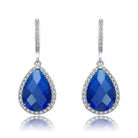 Stylish .925 Sterling silver sapphire cubic zirconia halo dangle earrings. Exquisite sapphire cubic zirconia solitaires in pear shapes make up the foundation of these dangle earrings. The look is completed by a halo of clear cubic zirconia stones. Crafted of .925 Sterling silver these earrings secure with lever back.