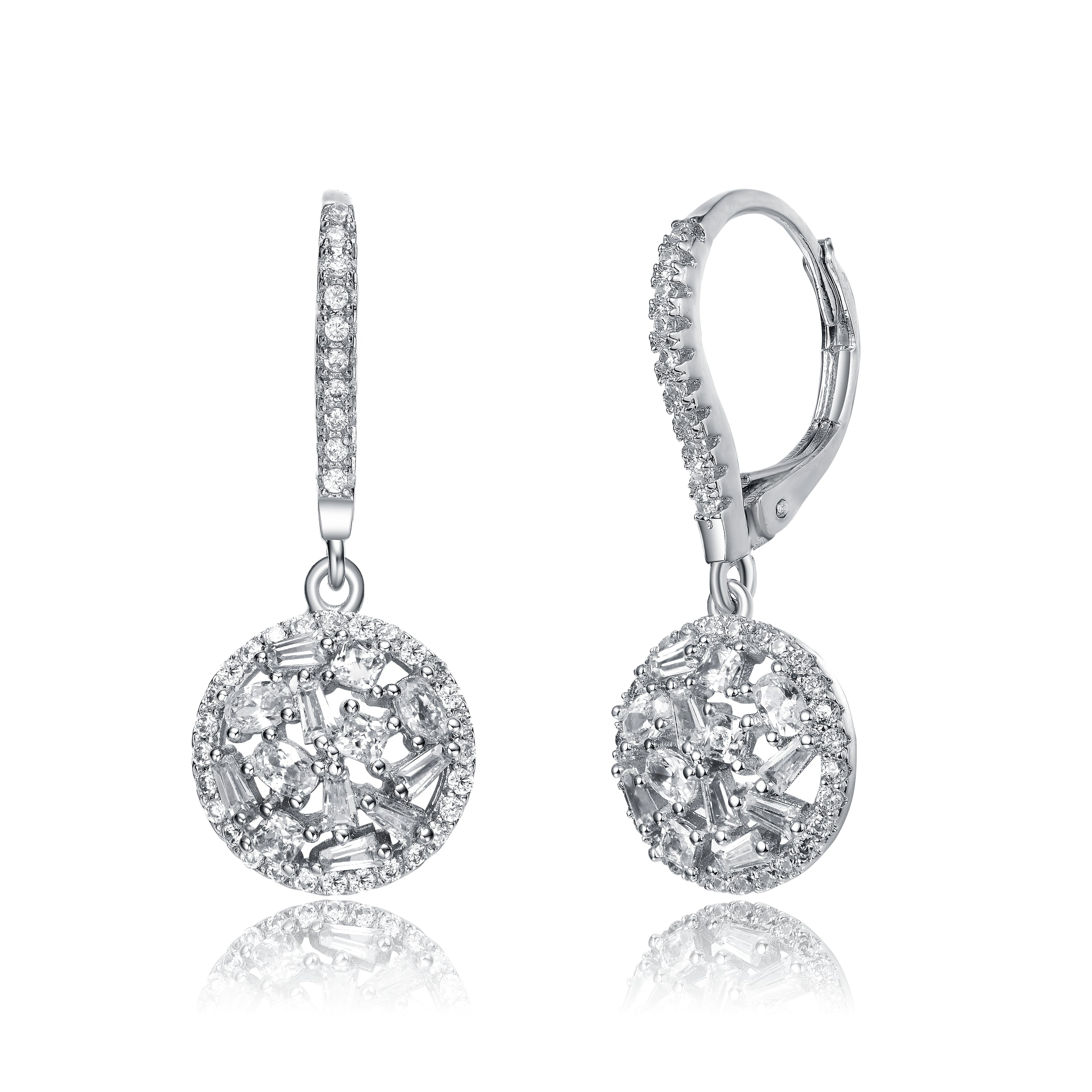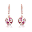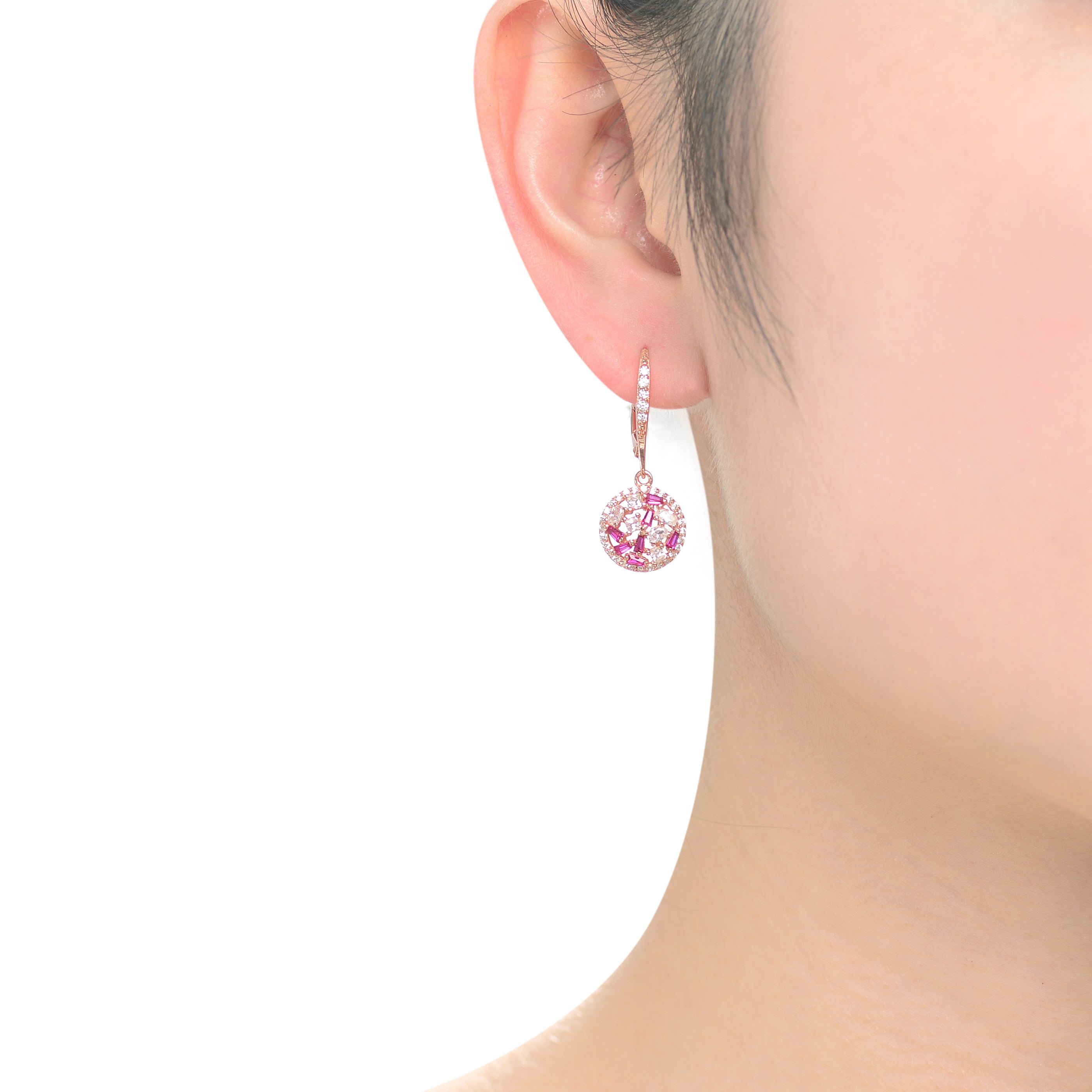 These earrings are very stylish. The pair features remarkable combination of simple base and stones in different cut . The ruby red trapped baguette clear cushion and clear oval cubic zirconia are the decorative part surrounded with clear round cubic zirconia. Made out of .925 Sterling silver with rose gold plating. The front part of the lever back is also decorated. These earrings secure with a lever back clasp. Comes in clear White as well.