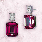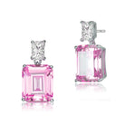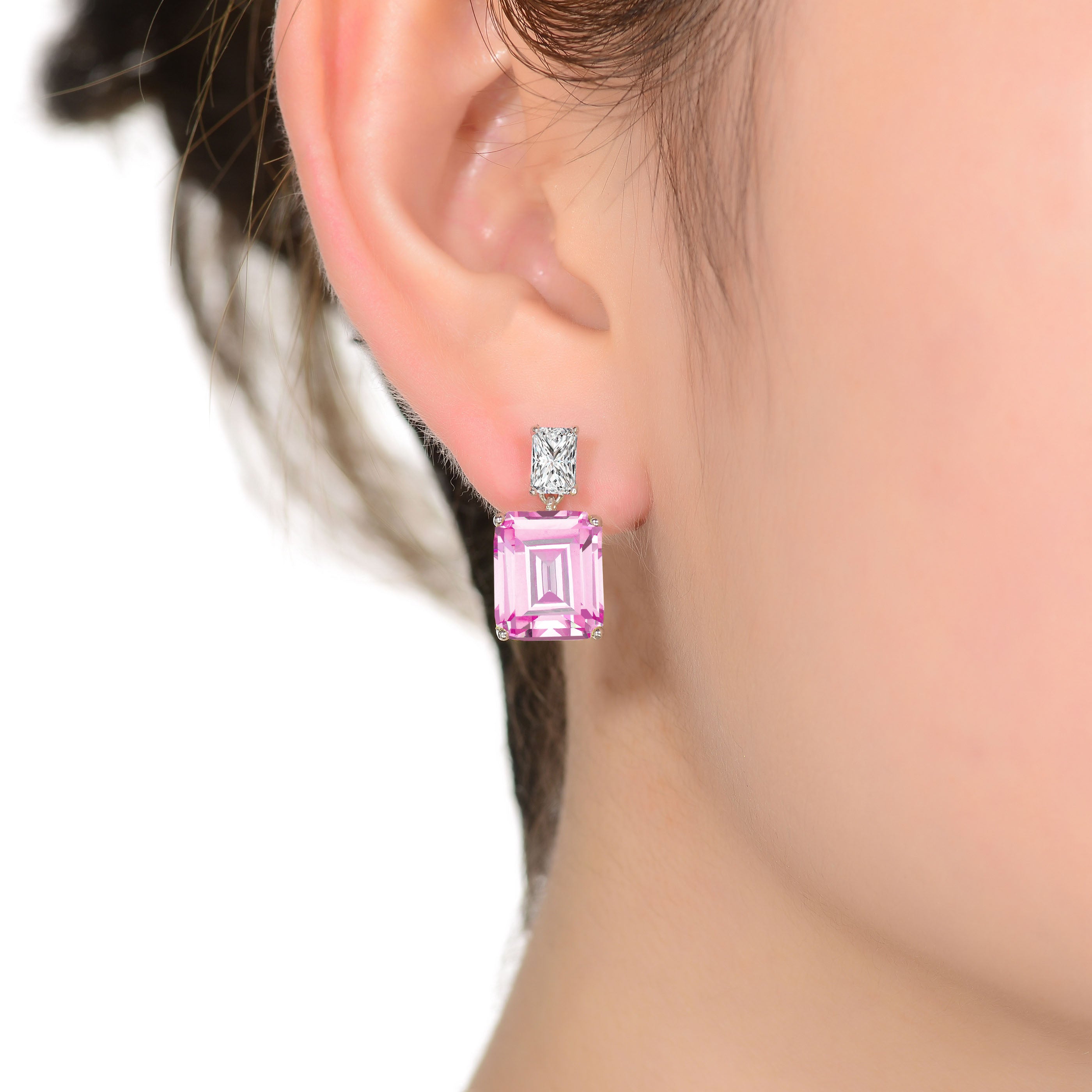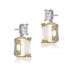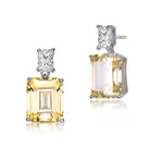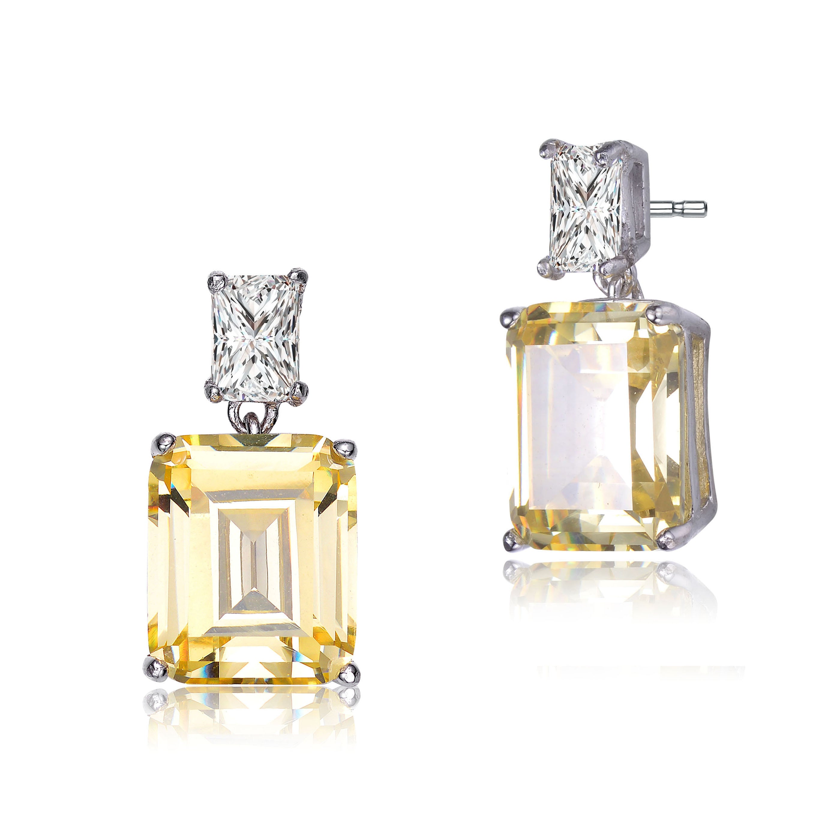 Stylish .925 Sterling silver emerald cubic zirconia rectangle stud earrings. These feature clear radiant cubic zirconia stone on the top and a drop of a vibrant large emerald green emerald cut cubic zirconia stone. crafted in .925 Sterling silver with White Gold plating and secure with butterfly closure. These earrings are also available in colors Ruby, Emerald, Pink, Sapphire and Yellow .