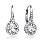 Stylish .925 Sterling silver cubic zirconia halo leaver back drop earrings. these glimmering earrings feature large clear round cubic zirconia stone accented by small clear round cubic zirconia stones around the stone and on the front of the leaver back as well. Crafted in Sterling silver White Gold plating and secure with lever back closure. Available in 14K Gold, 18K Rose and White Gold Plating.