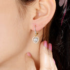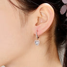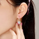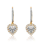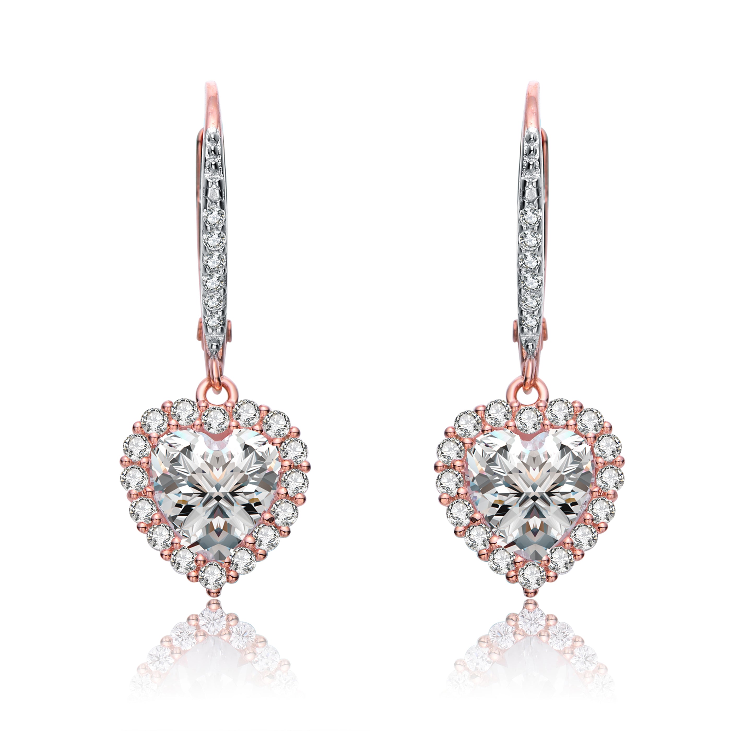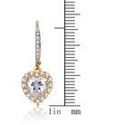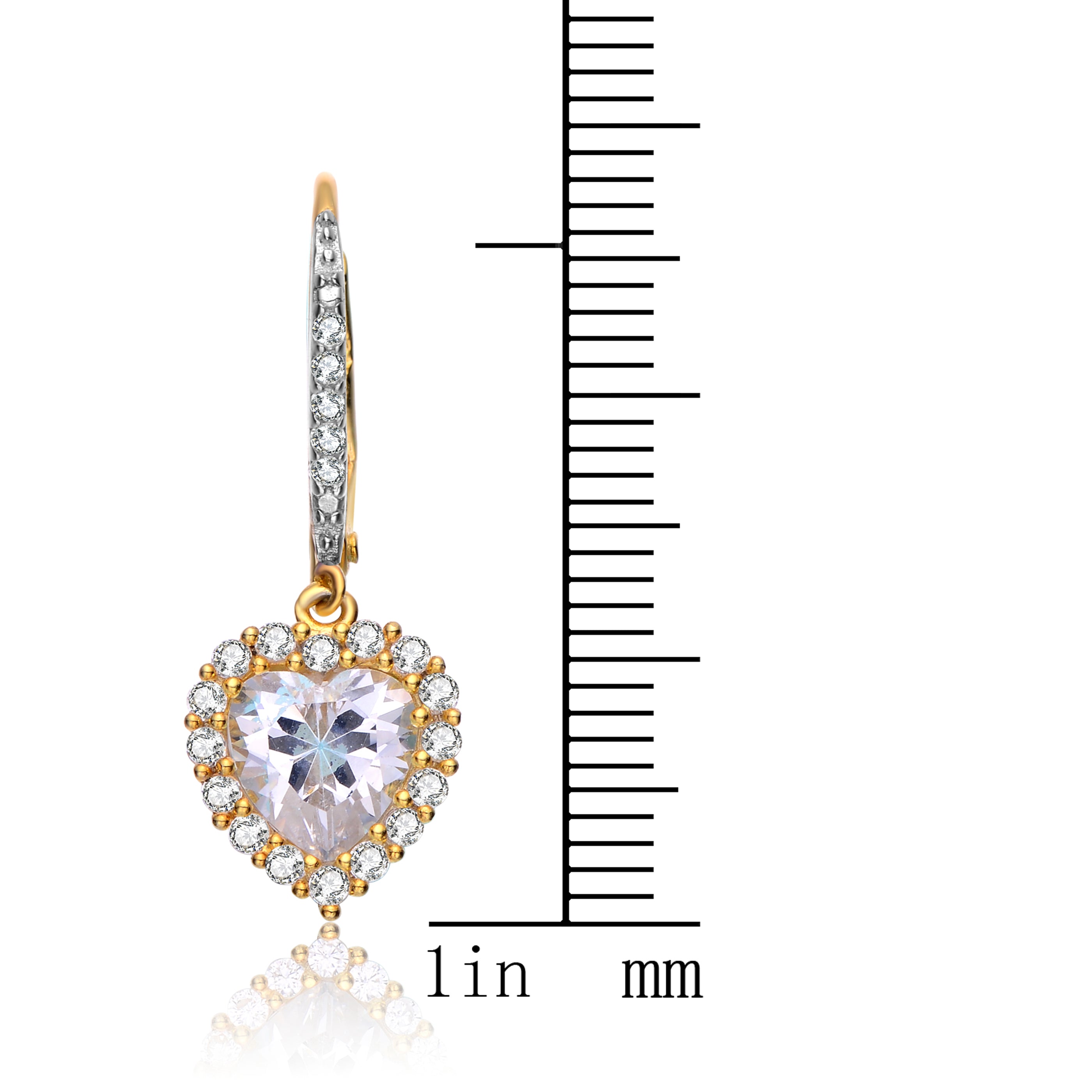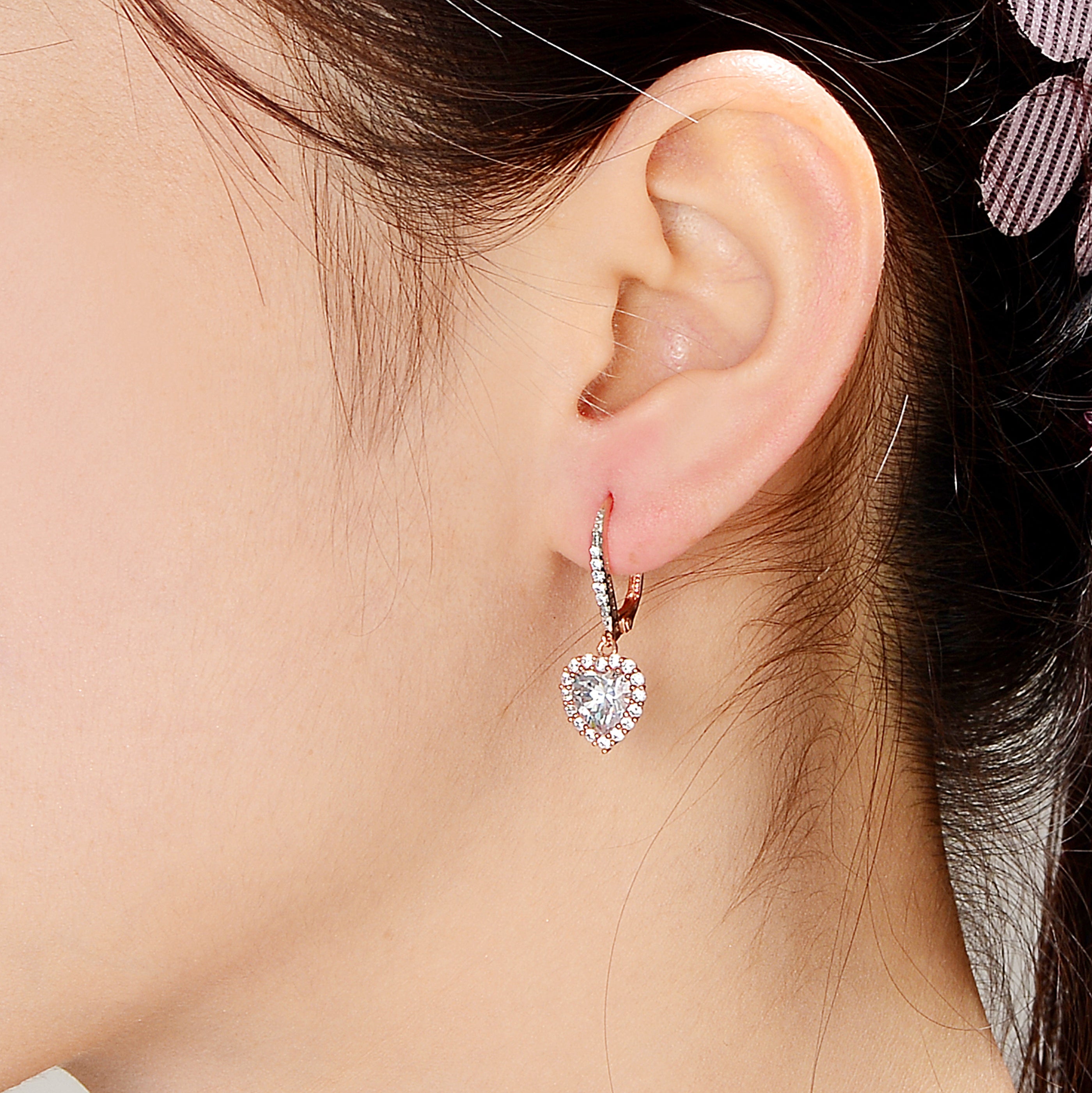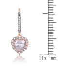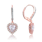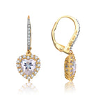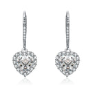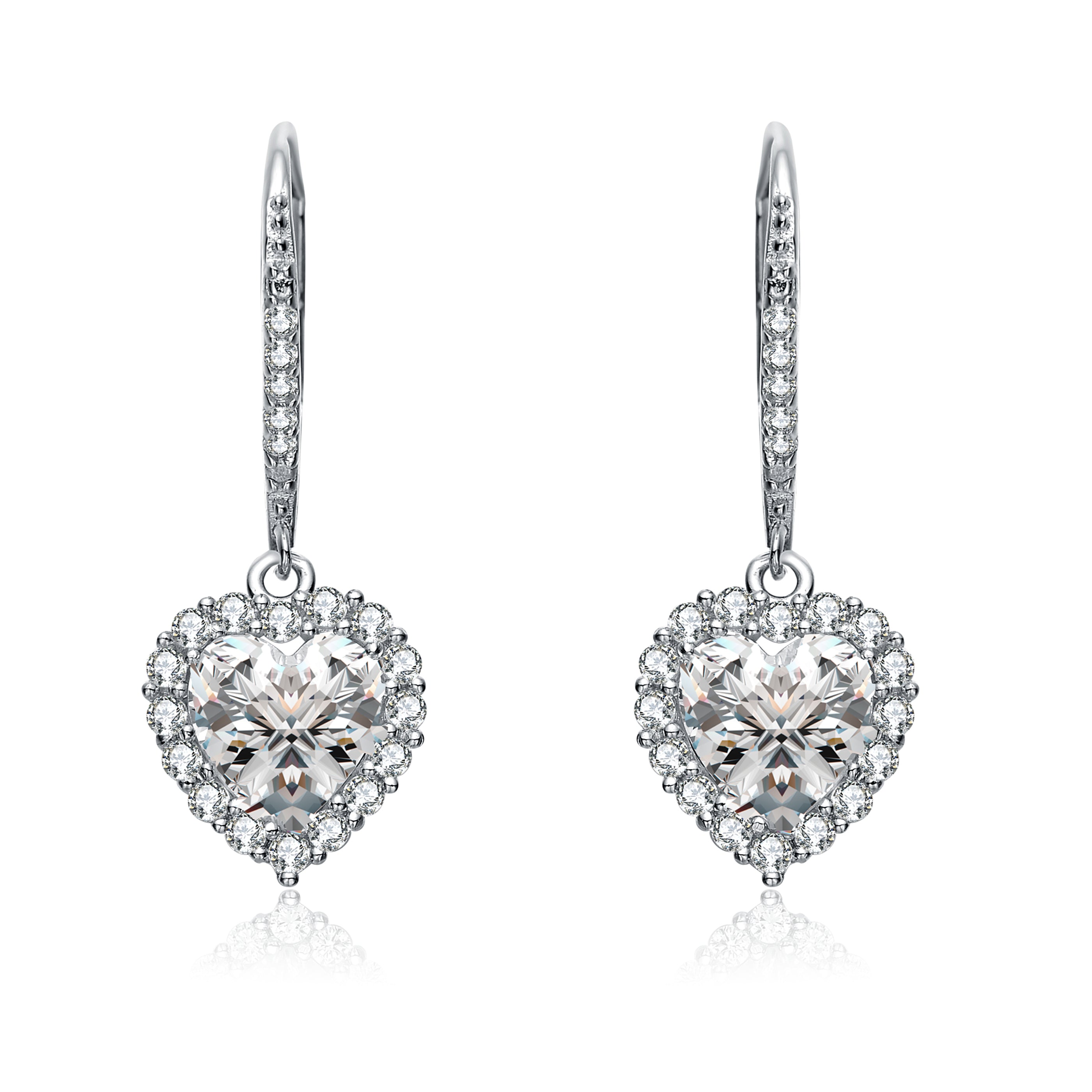 Stylish .925 Sterling silver cubic zirconia heart drop earrings. These earrings feature a clear heart cubic zirconia solitaire enveloped by a halo of smaller cubic zirconia stones. Crafted of .925 Sterling silver in White Gold plating and secure with leaver back closure. Available in gold and rose gold plating as well.