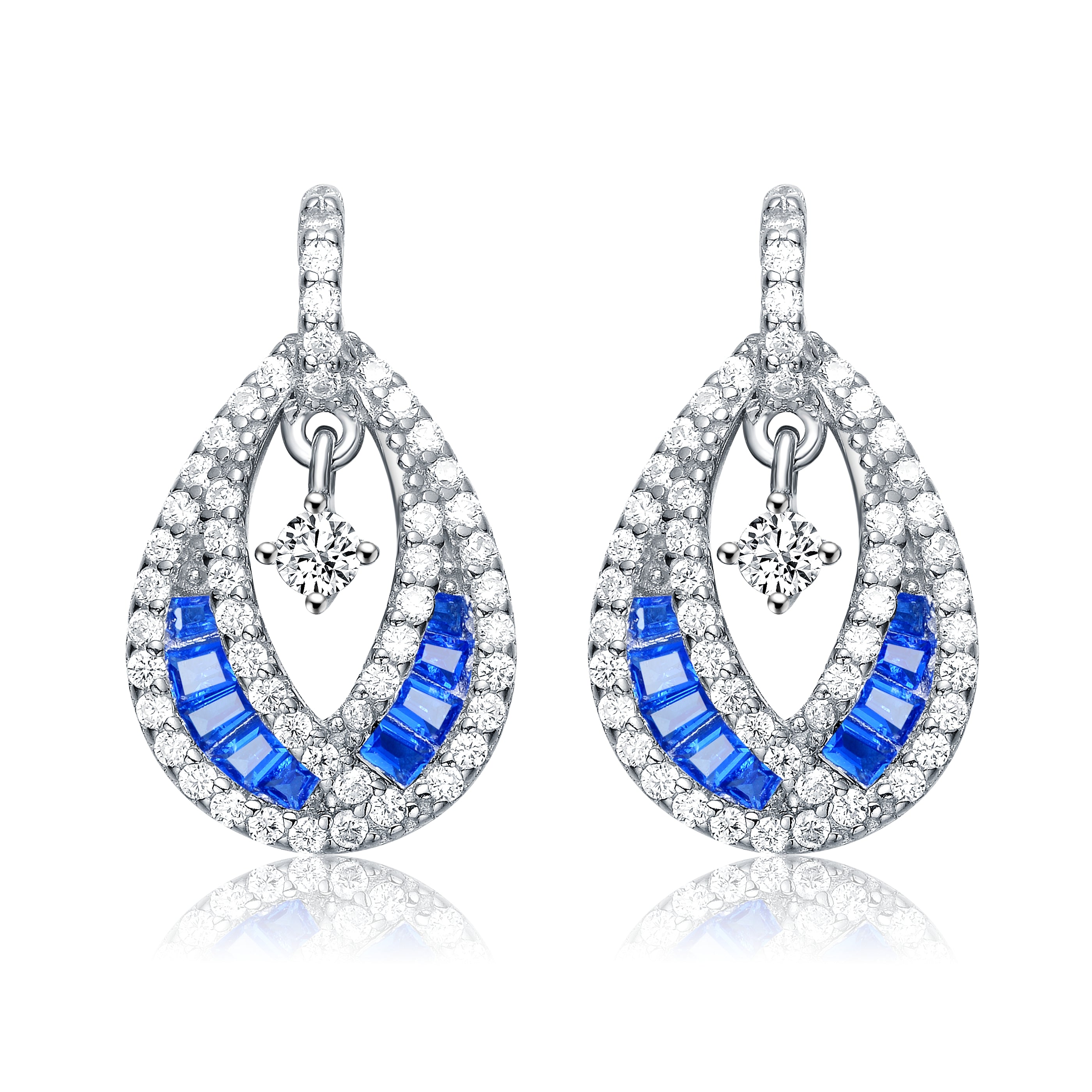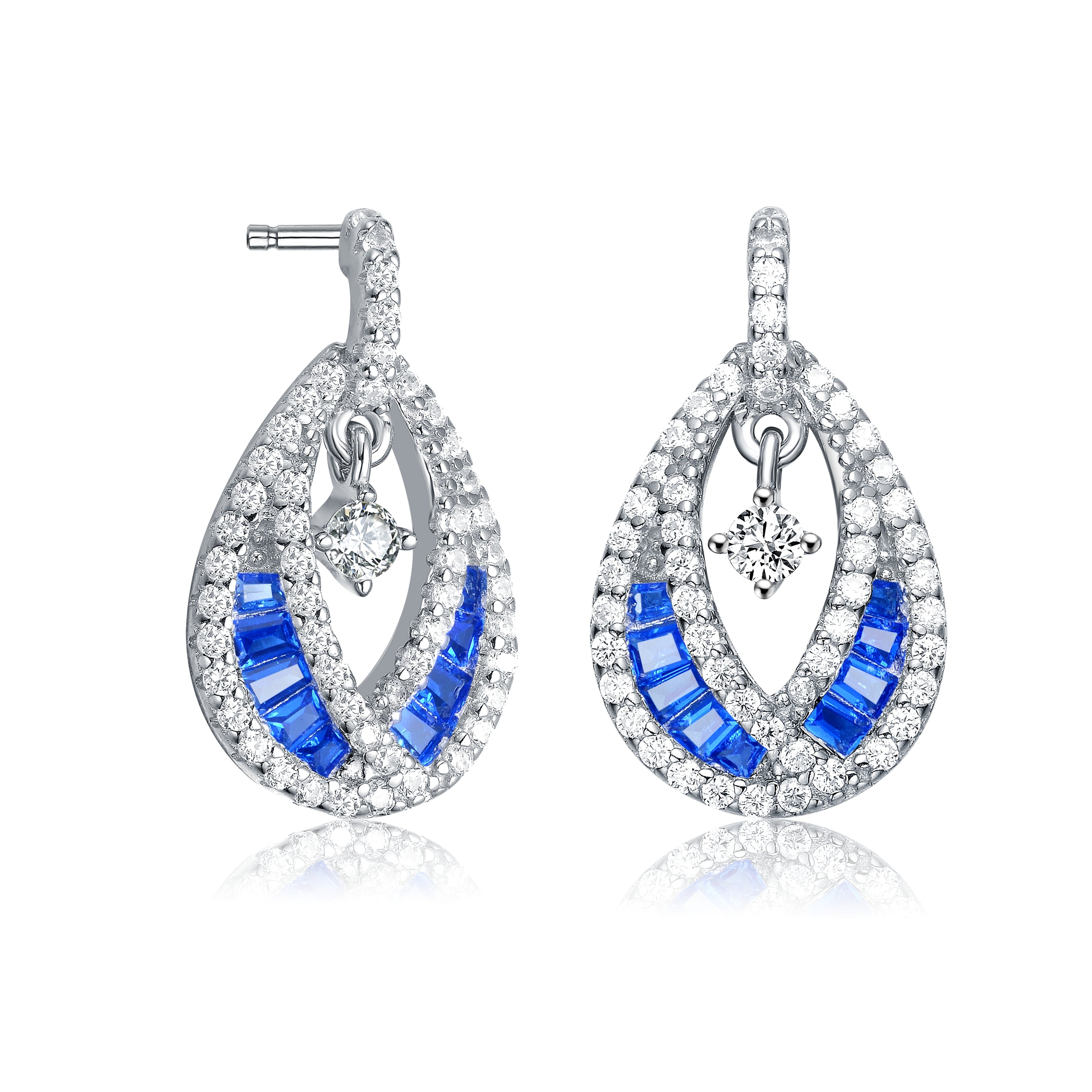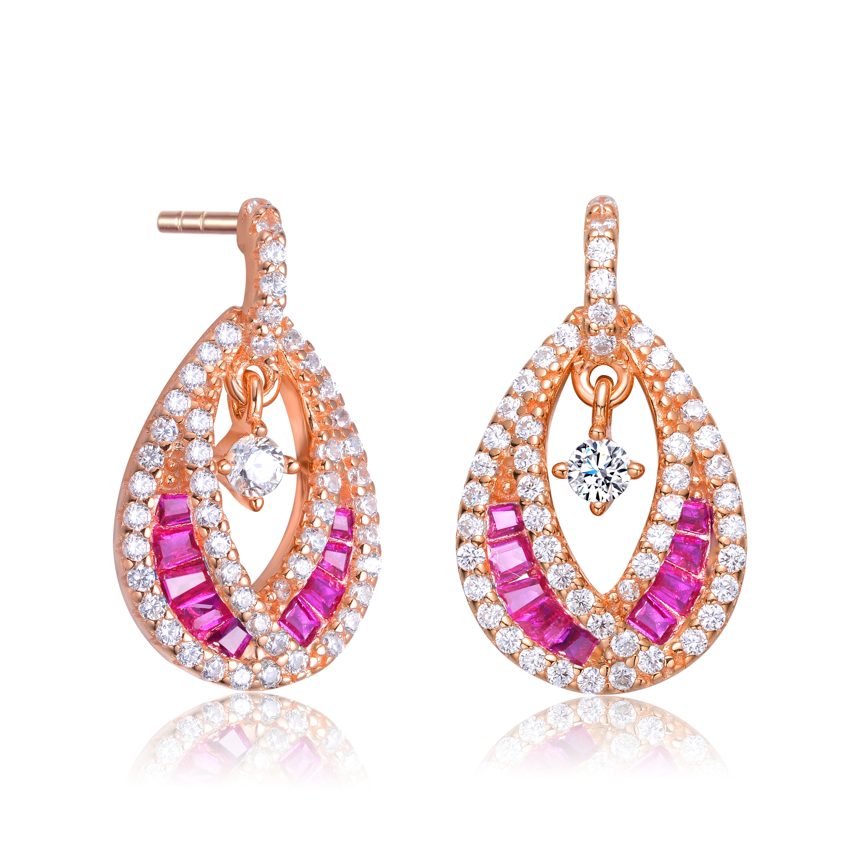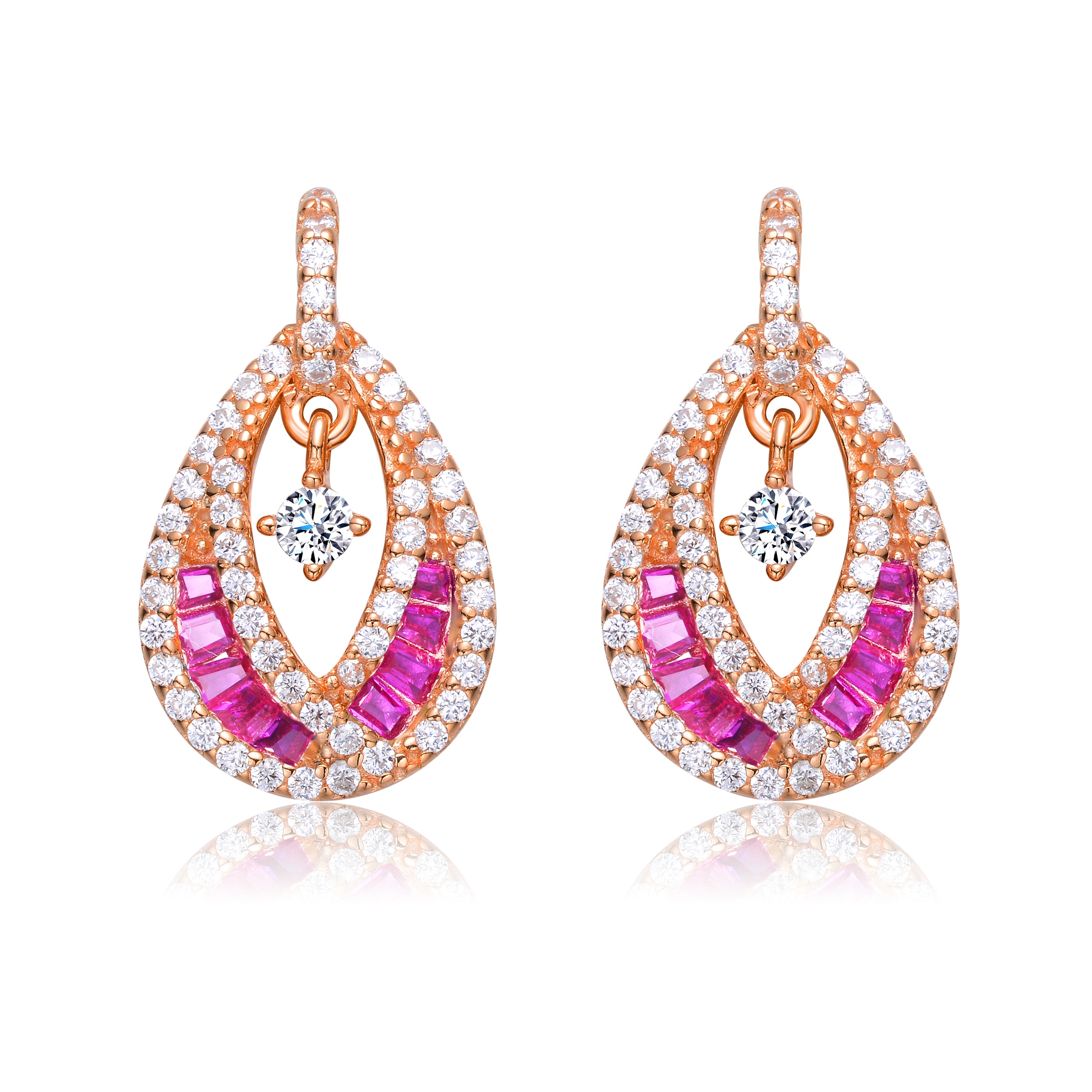Step out with these stylish Sterling silver earrings. These feature multi color trapped baguette cubic zirconia on both sides of the silver frame surrounded with clear round cubic zirconia paved on the frame forming a pear shape and clear round cubic zirconia in the center. This pair of earrings in gold plating is secured with butterfly clasp. Available in ruby with rose gold pkating and sapphire cubic zirconia with rhodium plating.