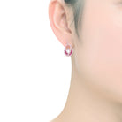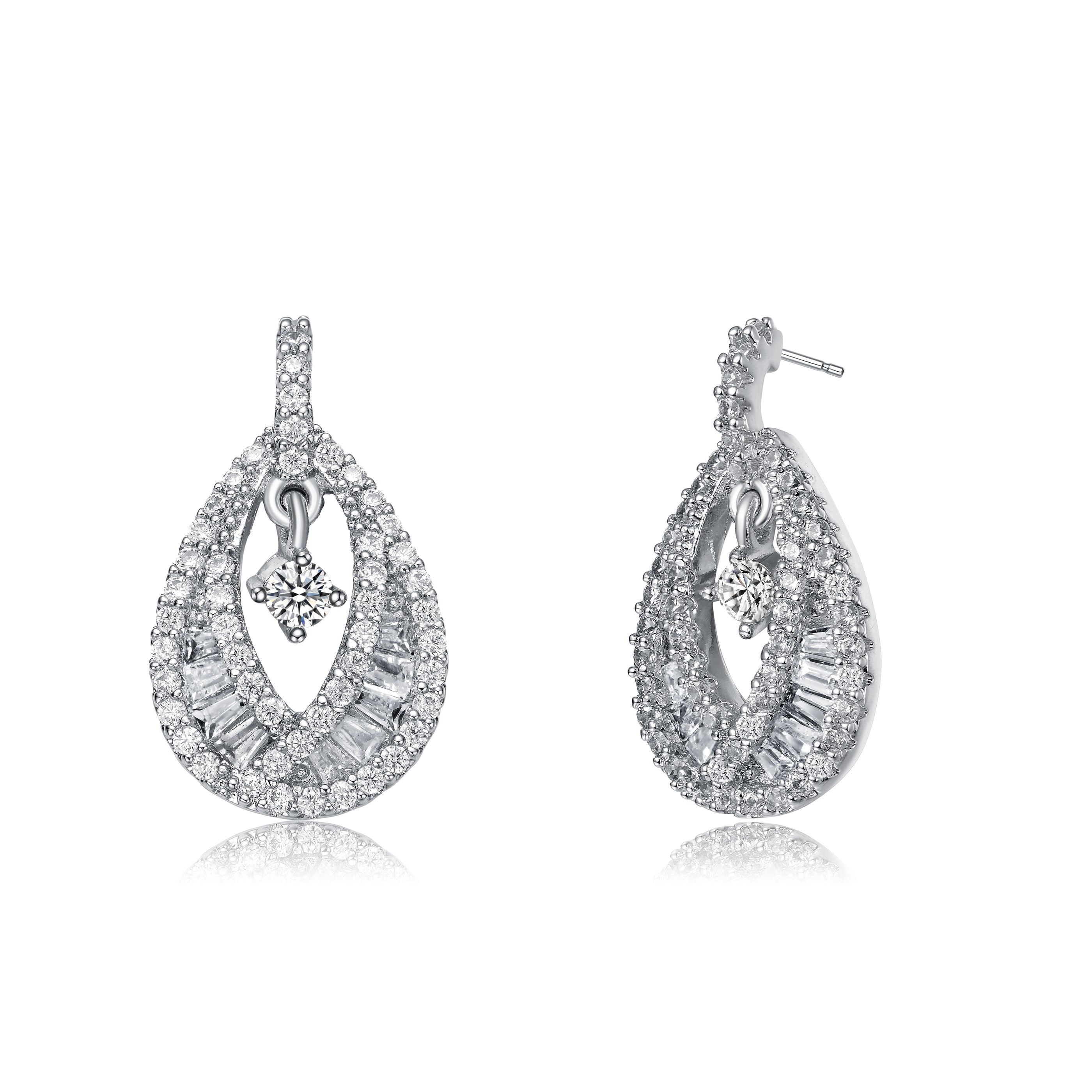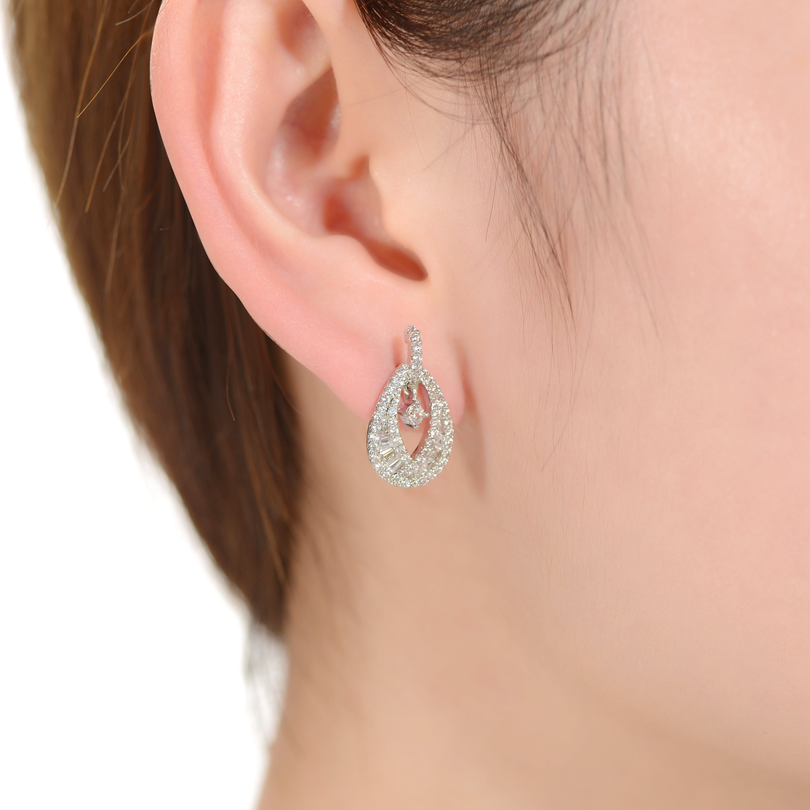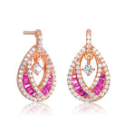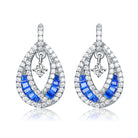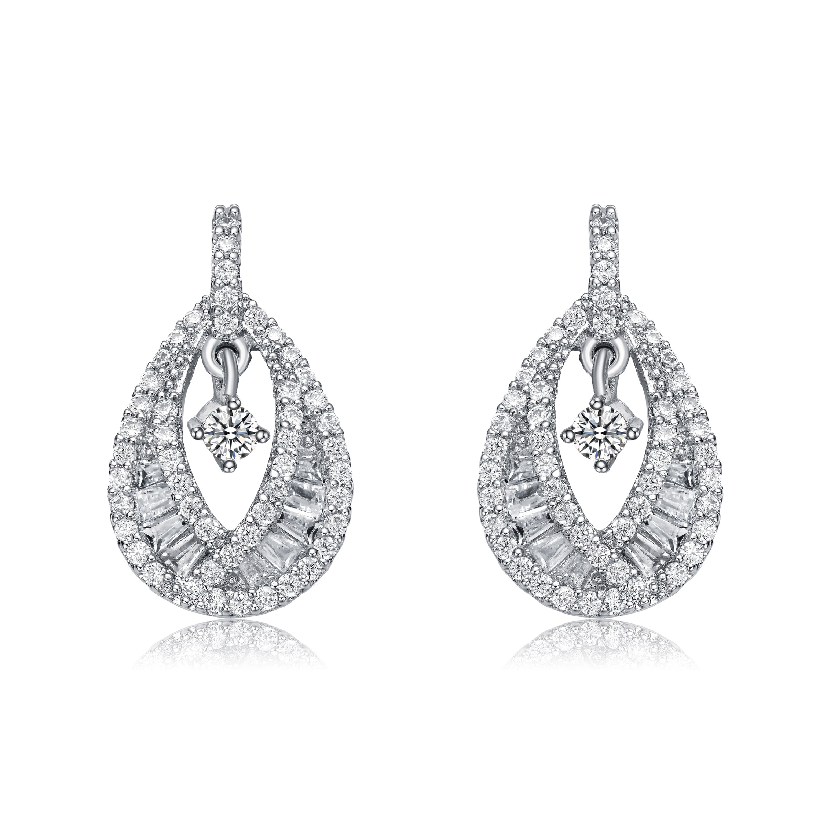 Step out with these stylish Sterling silver earrings. These feature multi color trapped baguette cubic zirconia on both sides of the silver frame surrounded with clear round cubic zirconia paved on the frame forming a pear shape and clear round cubic zirconia in the center. This pair of earrings in gold plating is secured with butterfly clasp. Available in ruby with rose gold pkating and sapphire cubic zirconia with rhodium plating.