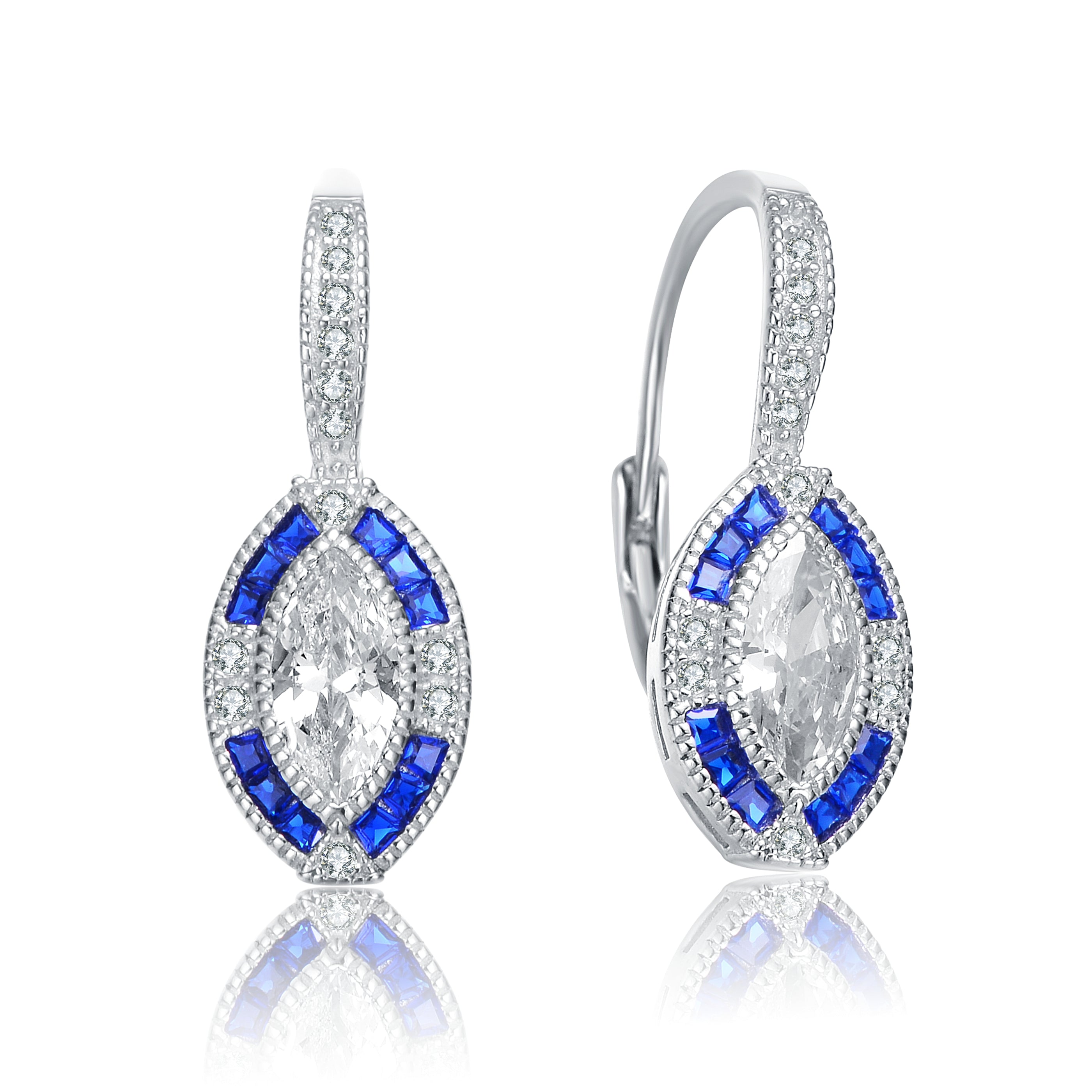 Stylish .925 Sterling silver oval lever back earrings. These earrings feature oval shape made out of clear oval cubic zirconia stone surrounded by blue baguette cubic zirconia stones and clear round cubic zirconia stones set on the metal frame. The front part of the leaver back is also decorated with small clear round cubic zirconia stones. Crafted in .925 Sterling silver with rhodium plating and it is secured with leaver back. This item makes a great gift as well.