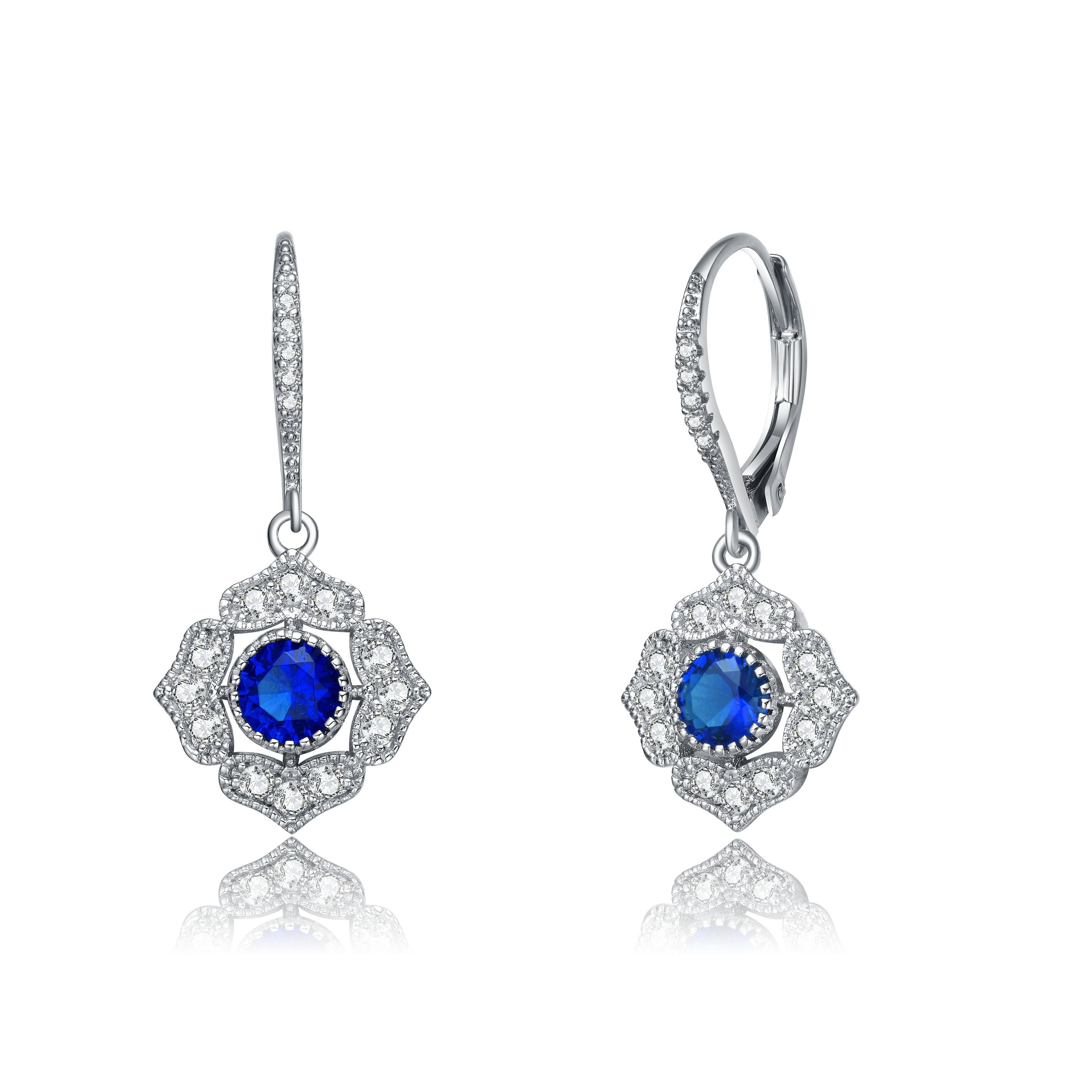 Stylish .925 Sterling silver sapphire cubic zirconia petal flower drop earrings. These beautiful lever back earrings feature petal flower design formed using four silver petal as base studded with clear round cubic zirconia on each side surrounding large clear round sapphire blue cubic zirconia stone. Crafted in .925 Sterling silver with rhodium plating and secure with lever back closure. Comes in color Green as well.