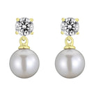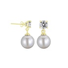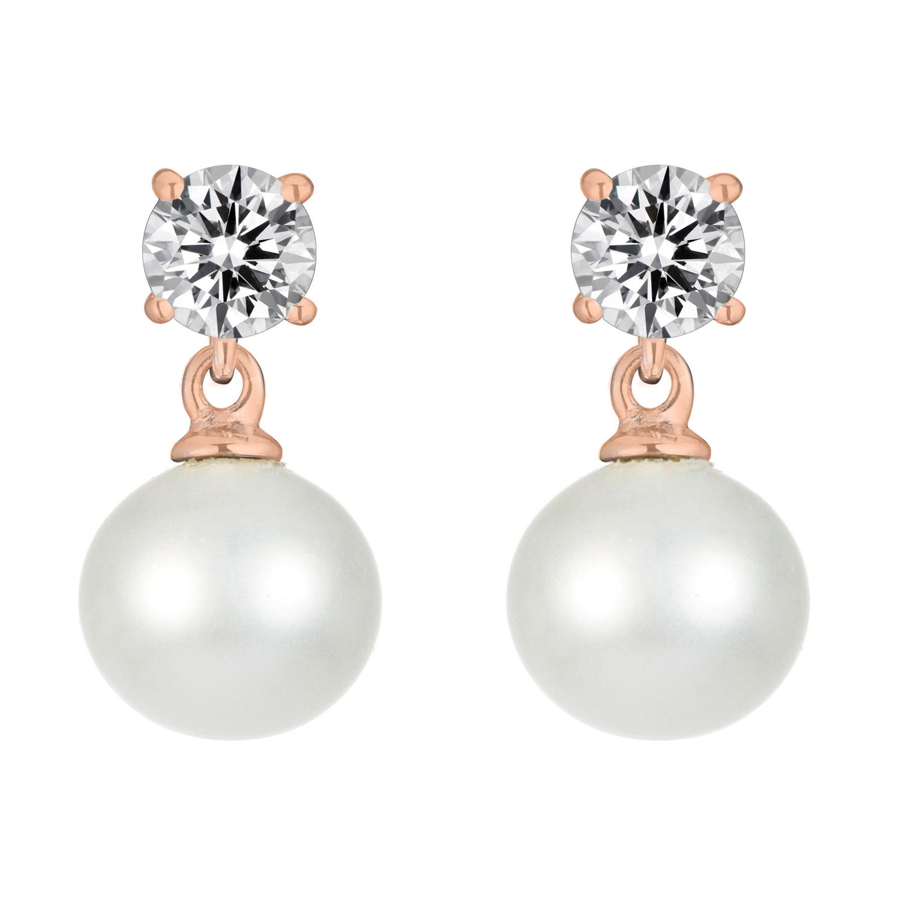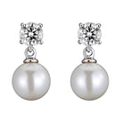 Each of these earrings features a single round white faux Pearl dangling under a post set with a clear round Cubic Zirconia. Butterfly clasps keep these fine Sterling silver with White Gold Plated earrings secure. This Earring is available in Rose gold and Gold Plating as well.