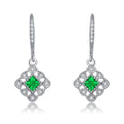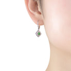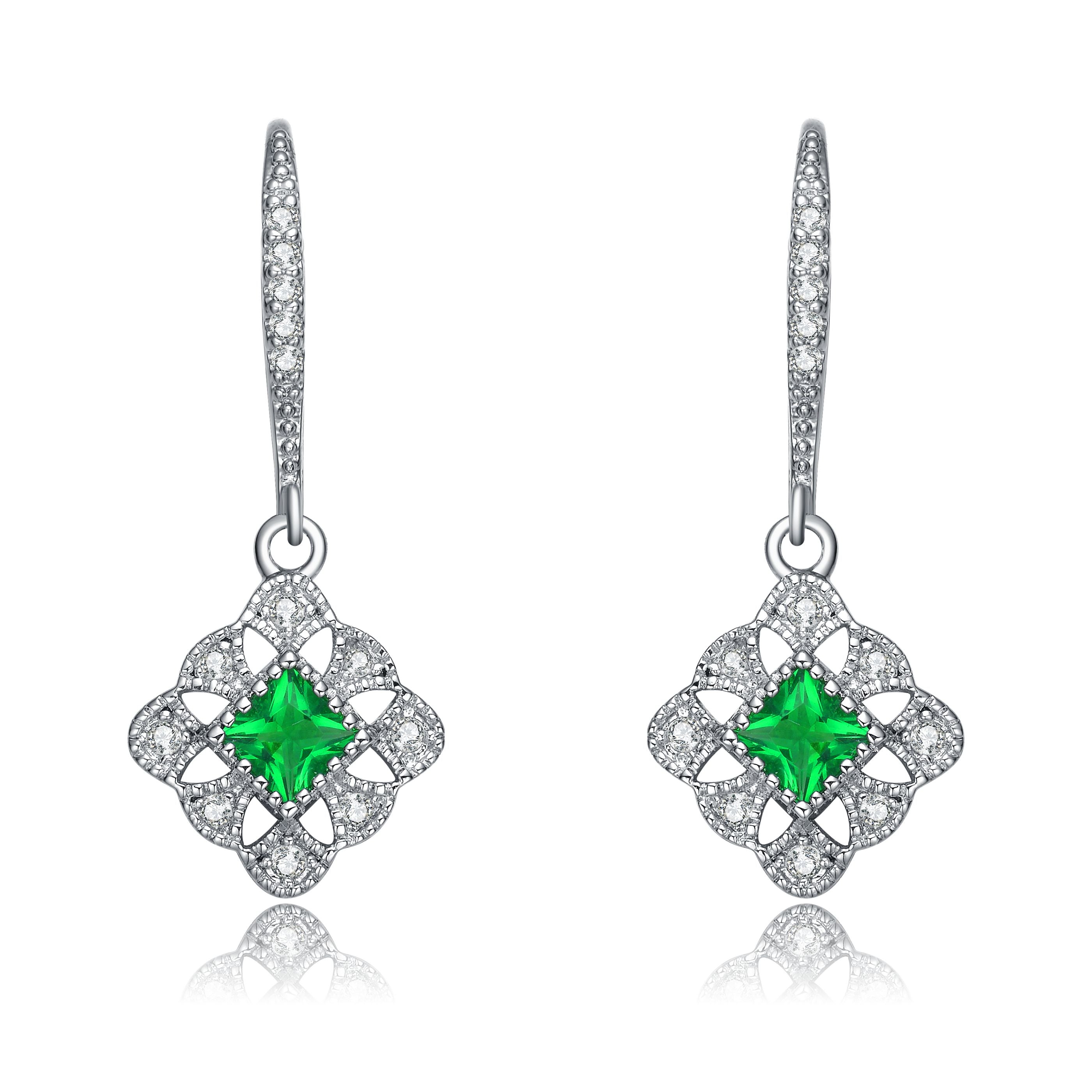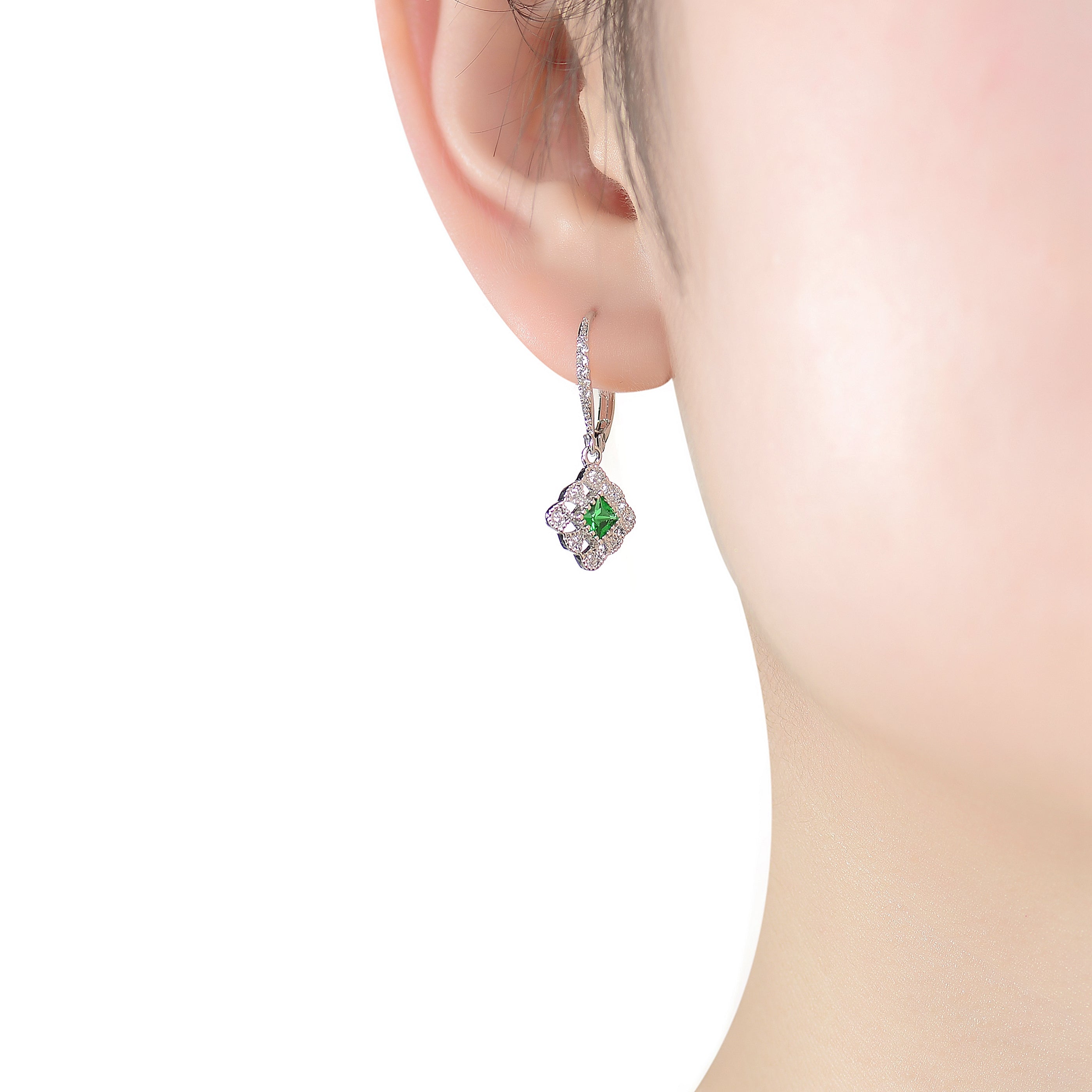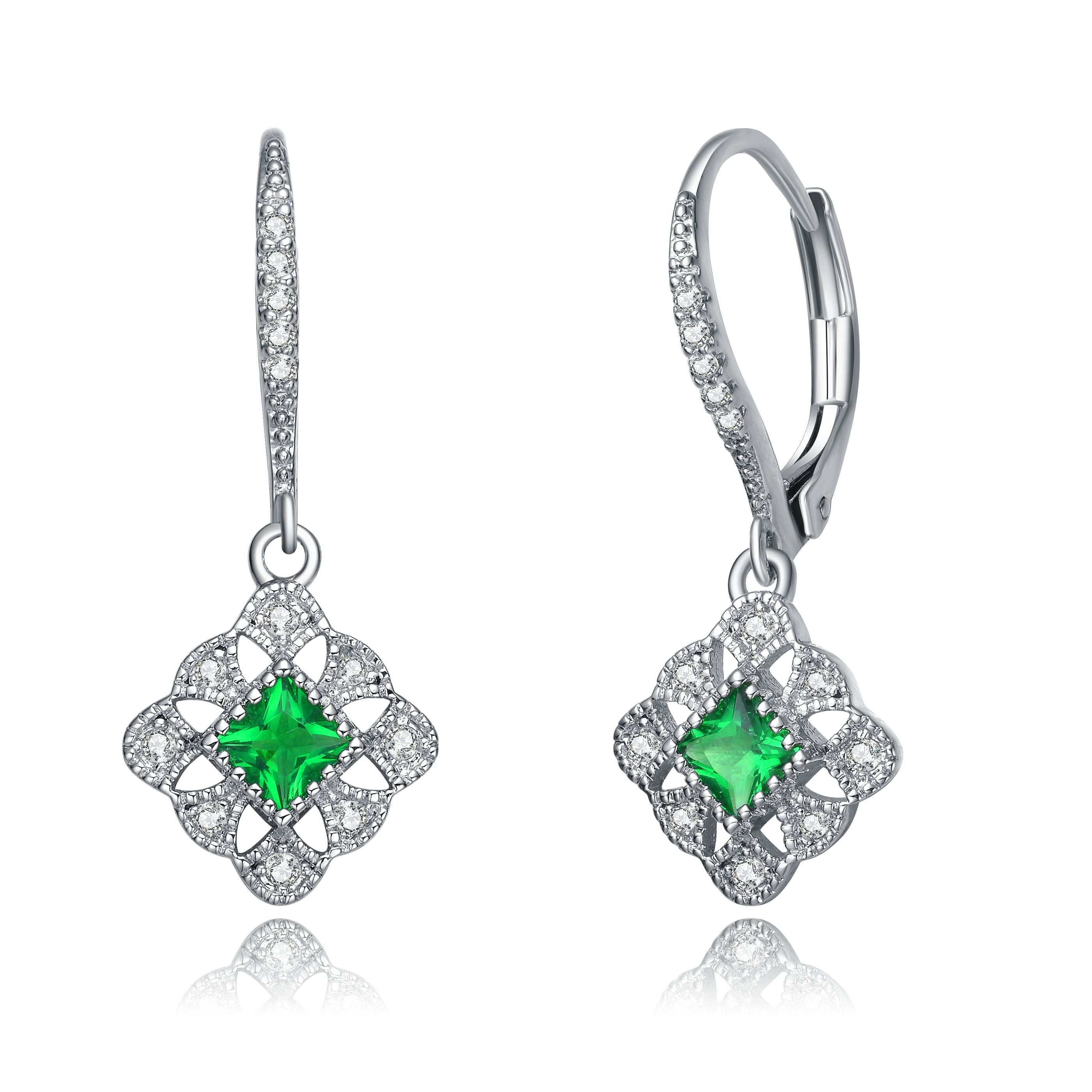 These beautiful lever back earrings are sure to add glam to your daily outfit. It is crafted in Sterling silver with White Gold plated. The fine curvy rhombus design is formed using three clear round cubic zirconia on each side surrounding the center sapphire radiant cubic zirconia stone. Crafted in Sterling silver with White Gold plating and secure with lever back closure. This earring is also available in Emerald, To fit your choice.