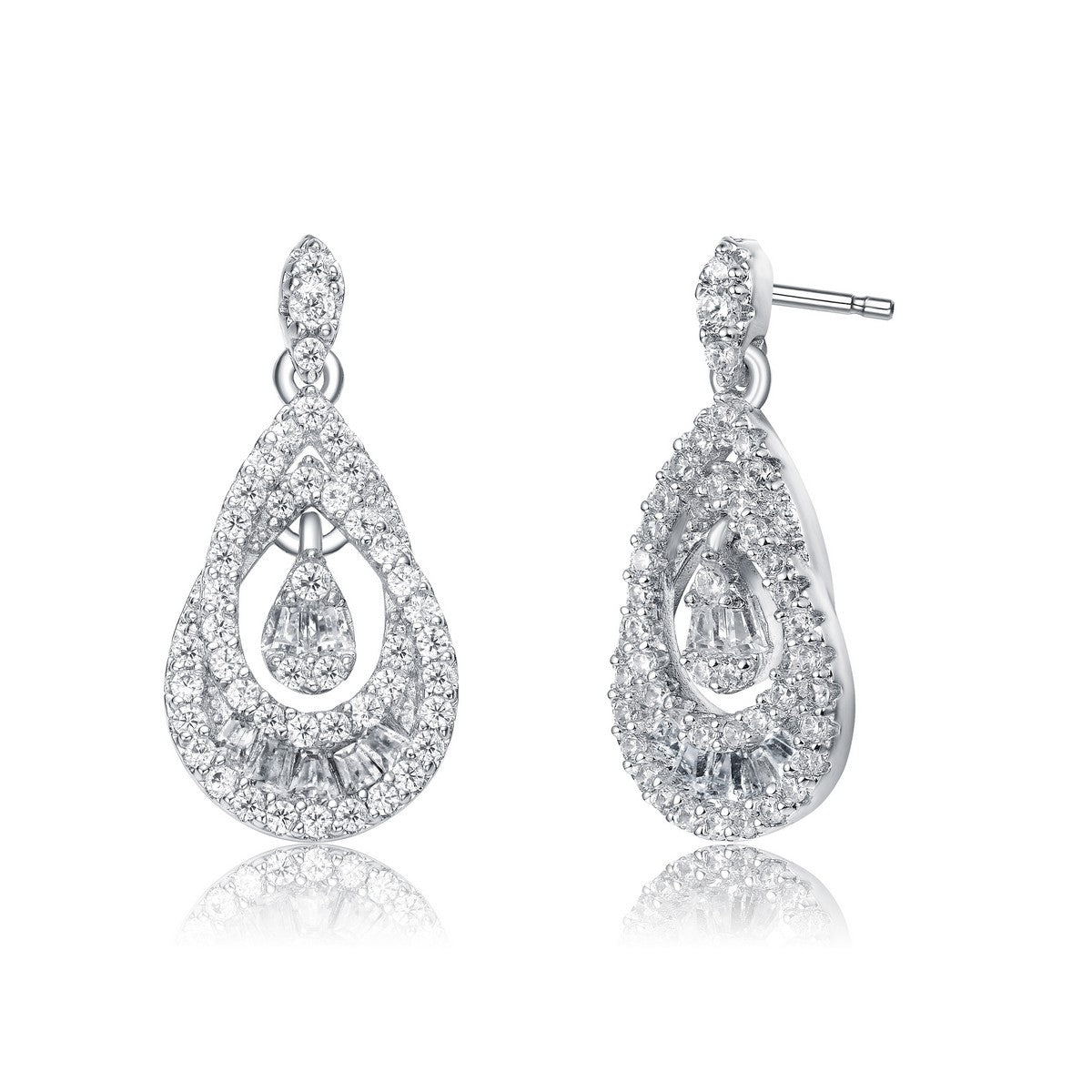 Step out with these fancy .925 Sterling silver earrings. These feature clear baguette and clear round cubic zirconia set on pear shaped frame that overlaps another pear shape frame surrounding the hanging center frame which is also studded with clear baguette cubic zirconia. This pair of earrings is secured with butterfly clasp.
