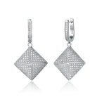 Stylish .925 Sterling silver cubic zirconia dangle earrings. These showy diamond shaped dangling earrings are decorated with clear round cut cubic zirconia stones. Crafted of .925 Sterling silver with rhodium plating and secure with clip on clasps.