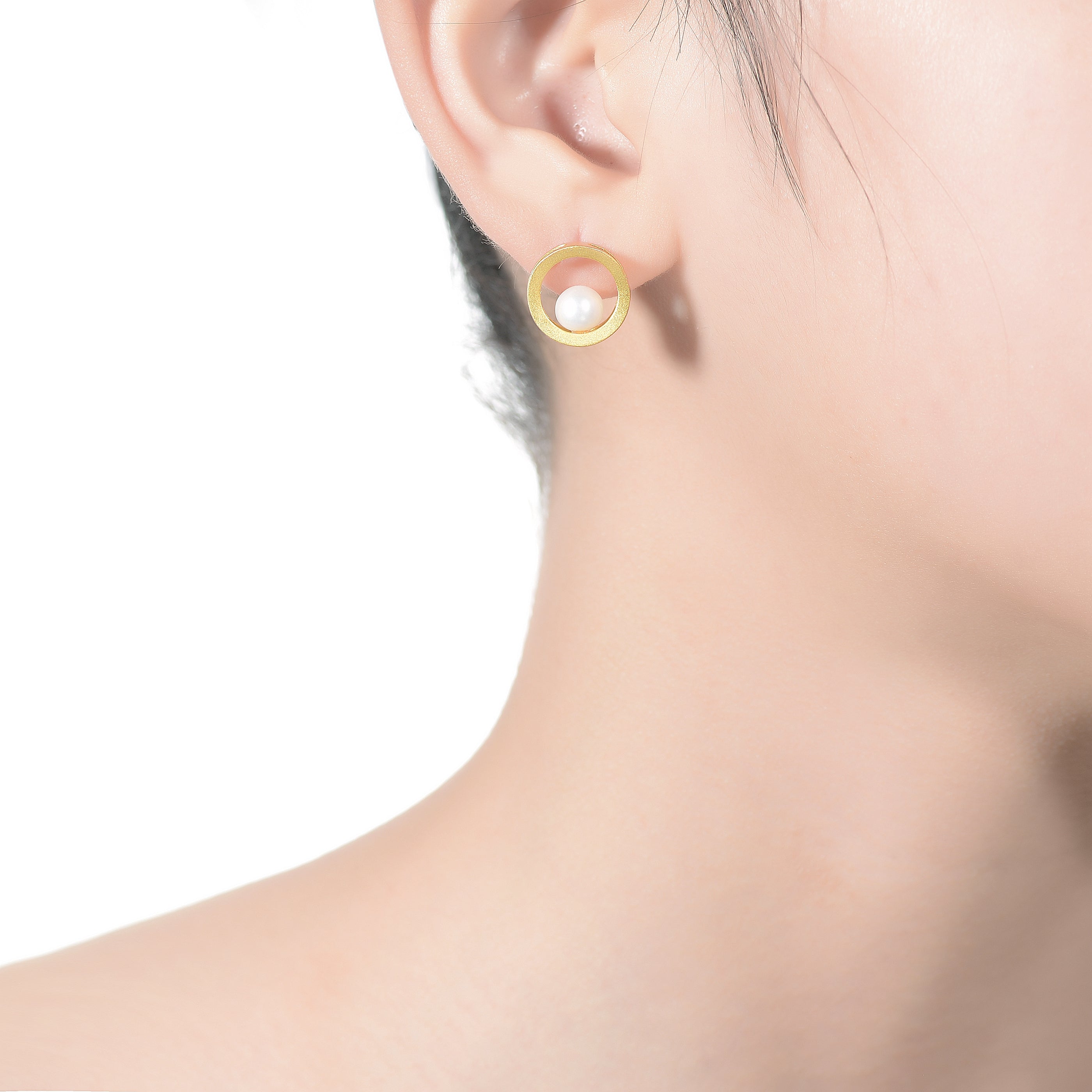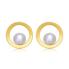 One of a kind .925 Sterling silver gold plated with freshwater pearl stud earrings. These earrings feature round freshwater pearl set on the inner part of the round gold metal frame. Crafted in .925 Sterling silver with gold plating and it is secured with butterfly closure. This item is great addition to any outfit. Makes a great gift as well.