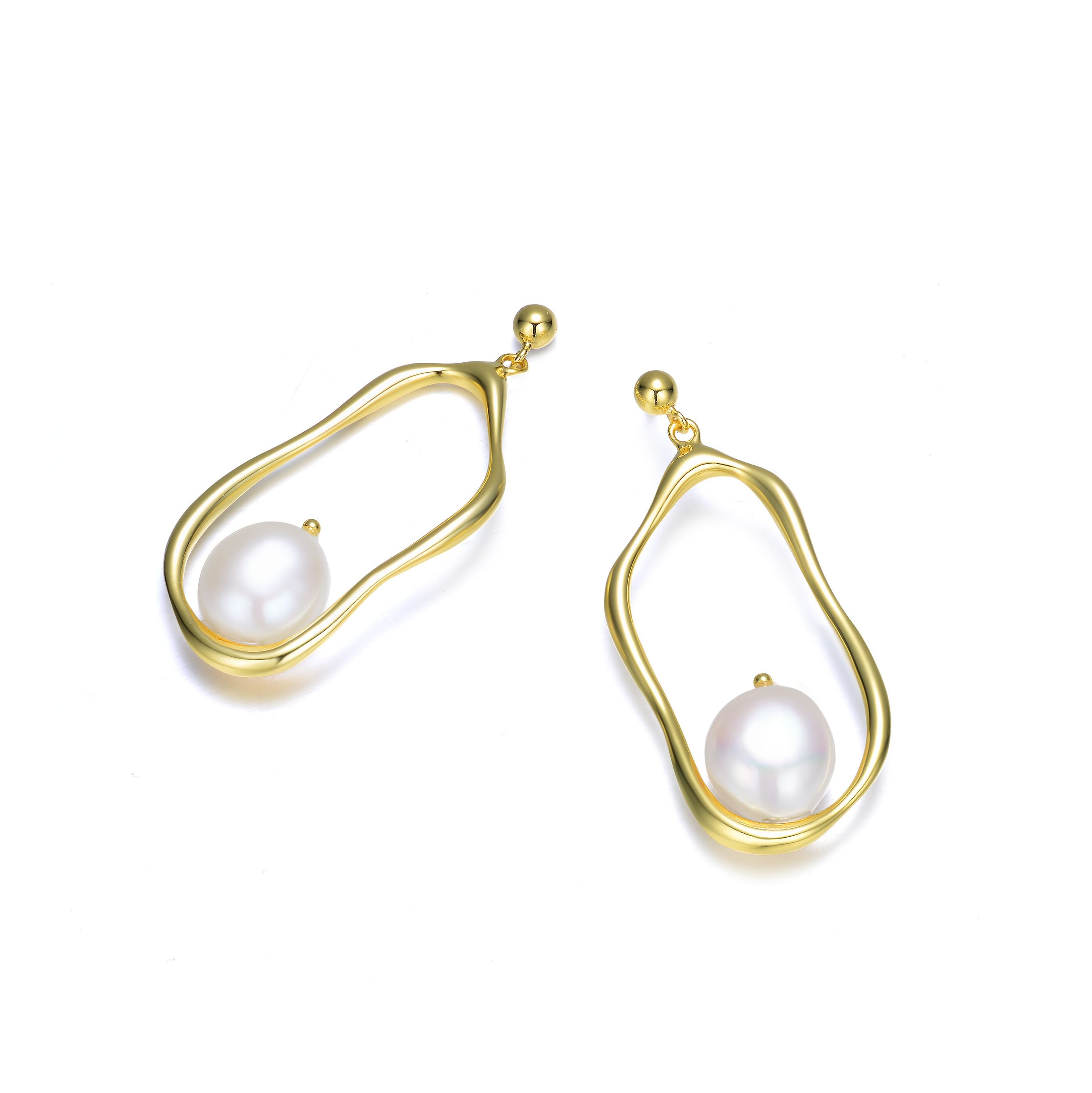 Classy .925 Sterling silver with gold plating and freshwater curvy dangling earrings. This special set of earrings features unique curvy hoops with freshwater pearls that sit inside at the center arc area. Crafted in .925 Sterling silver the piece is secured with a butterfly clasp. This jewelry is perfect for a formal event.