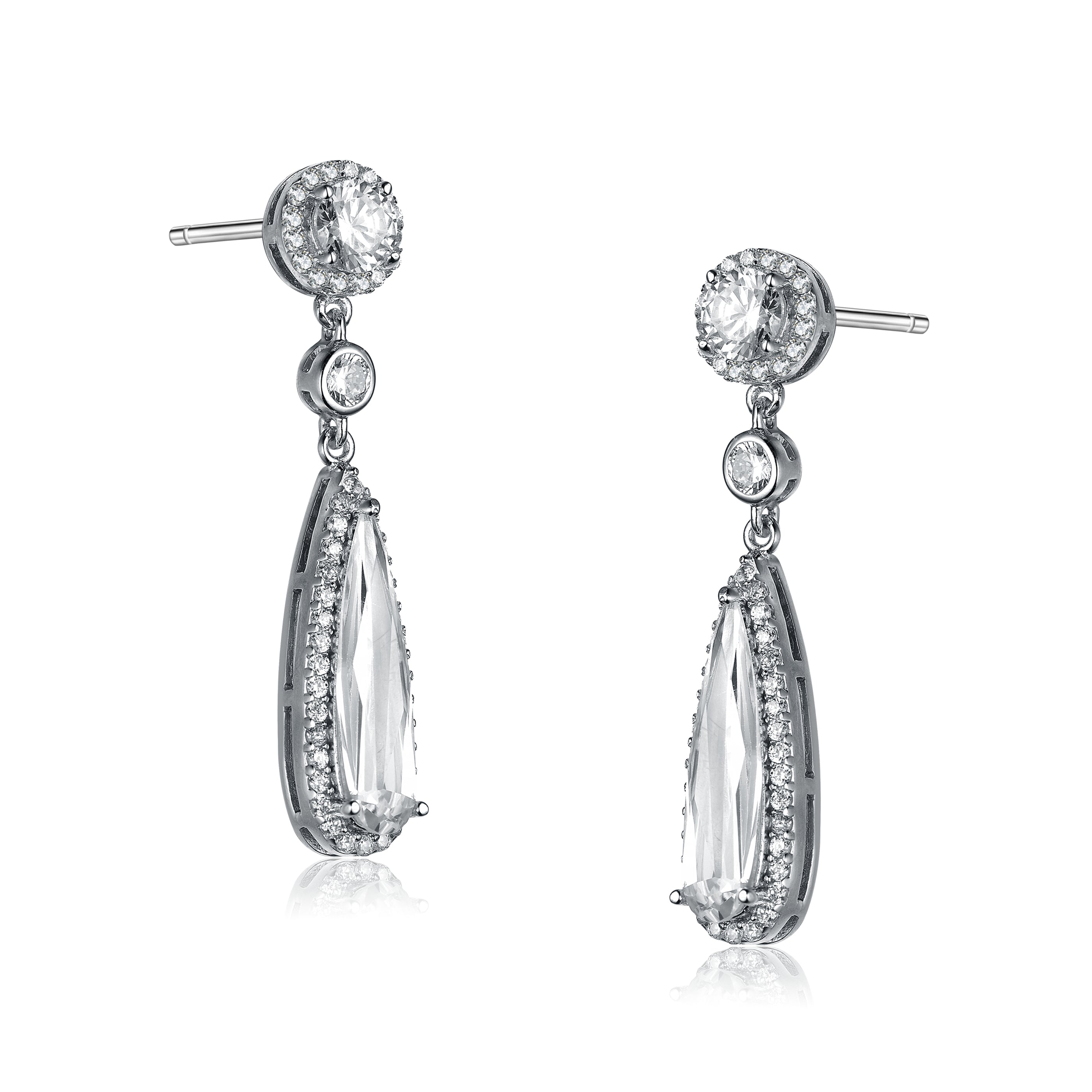 Stylish .925 Sterling silver multi shaped cubic zirconia teardrop earrings. These elegant pear shape dangling earrings feature dazzling clear round and pear cubic zirconia stones. The center stone is set in prong setting in the center of the silver frame accented by smaller clear round cubic zirconia stones. Crafted of .925 Sterling silver with rhodium plating and secure with butterfly closure.