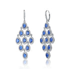 Elegant .925 Sterling silver sapphire cubic zirconia chandelier earrings. These earrings feature blue oval cut cubic zirconia stones set in prong setting surrounded with smaller clear cubic zirconia stones. Crafted of .925 Sterling silver with rhodium plating and secure with butterfly closure.