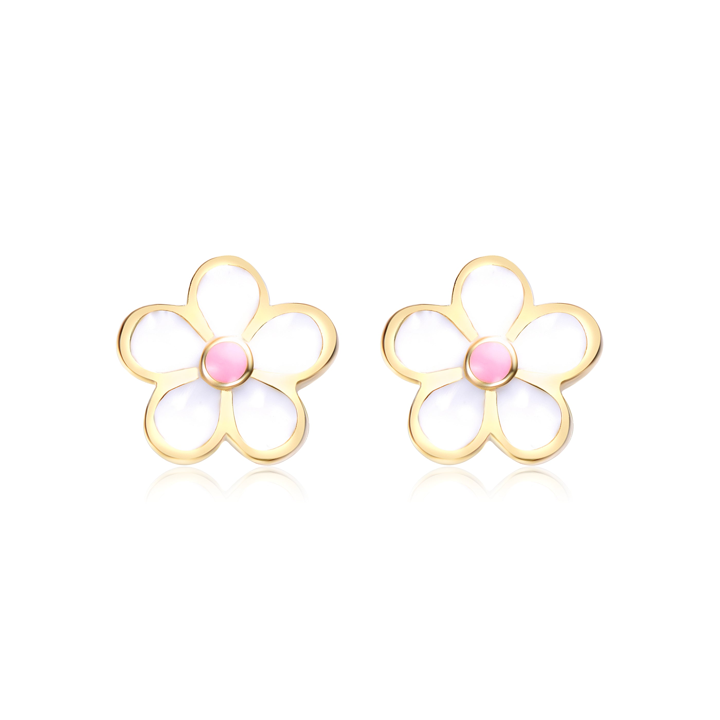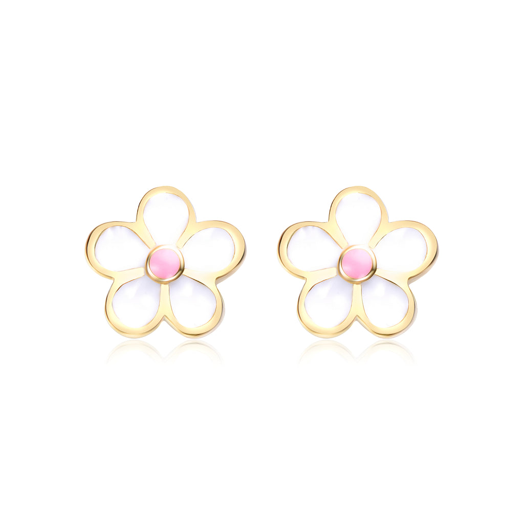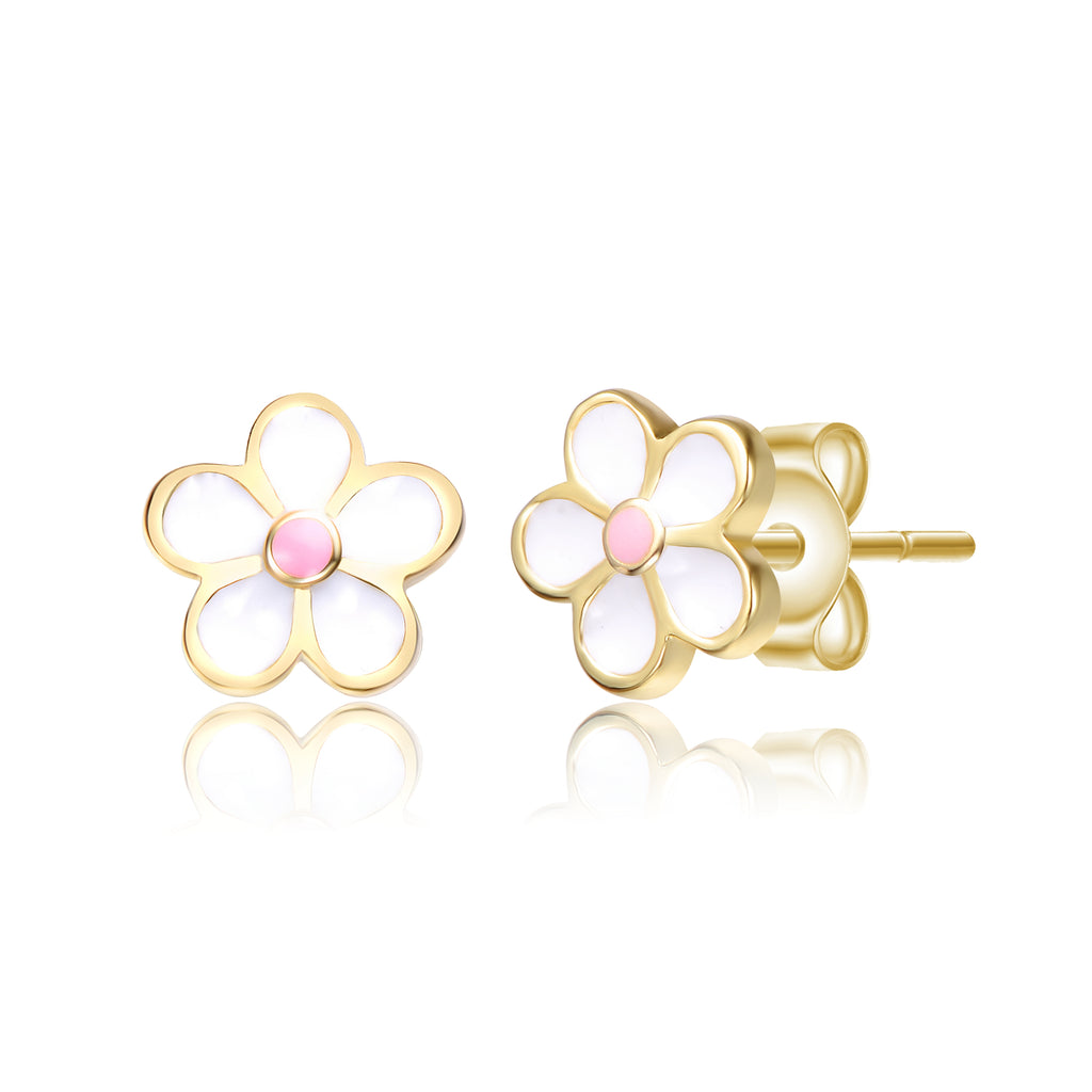 Children's Sterling Silver 14k Gold Plated Pink Flower Daisy Earrings. These brightly polished 14k gold plated kid's earrings make a sentimental present for your lovely child for a holiday, birthday, and other special occasions. A pink enamel daisy with a white enamel outline adds a pop of joy and happiness to any day with its eye-catching vibrancy. These earrings feature secure screwback closures, offering both safety and comfort for even the youngest wearers.