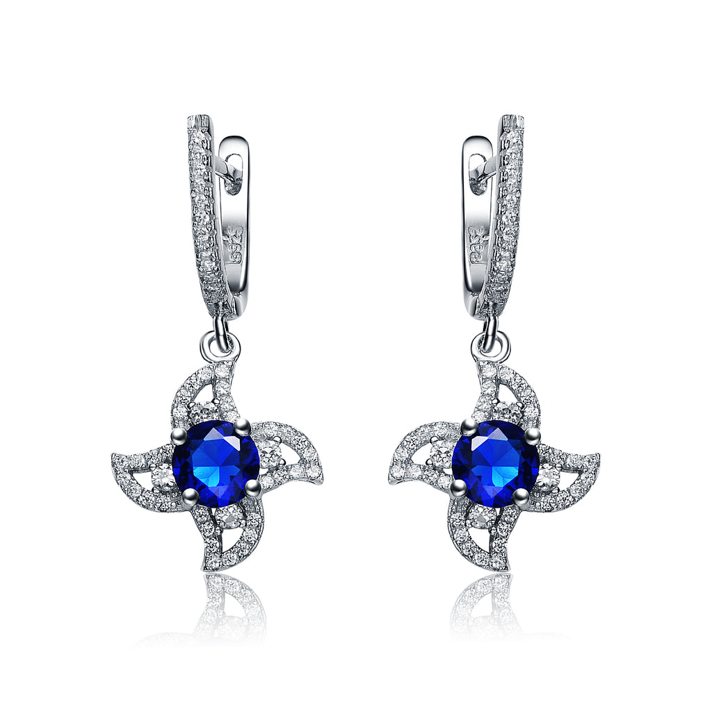 Enhance your elegance with these exquisite sterling silver earrings, plated with rhodium for a lasting shine. The unique floral design features dazzling cubic zirconia stones surrounding a stunning deep blue sapphire-hued center, creating a mesmerizing contrast. These lightweight dangle earrings are secured with sparkling hoop closures for added charm and durability. Perfect for formal occasions or a luxurious everyday look, these earrings are a must-have addition to your jewelry collection.