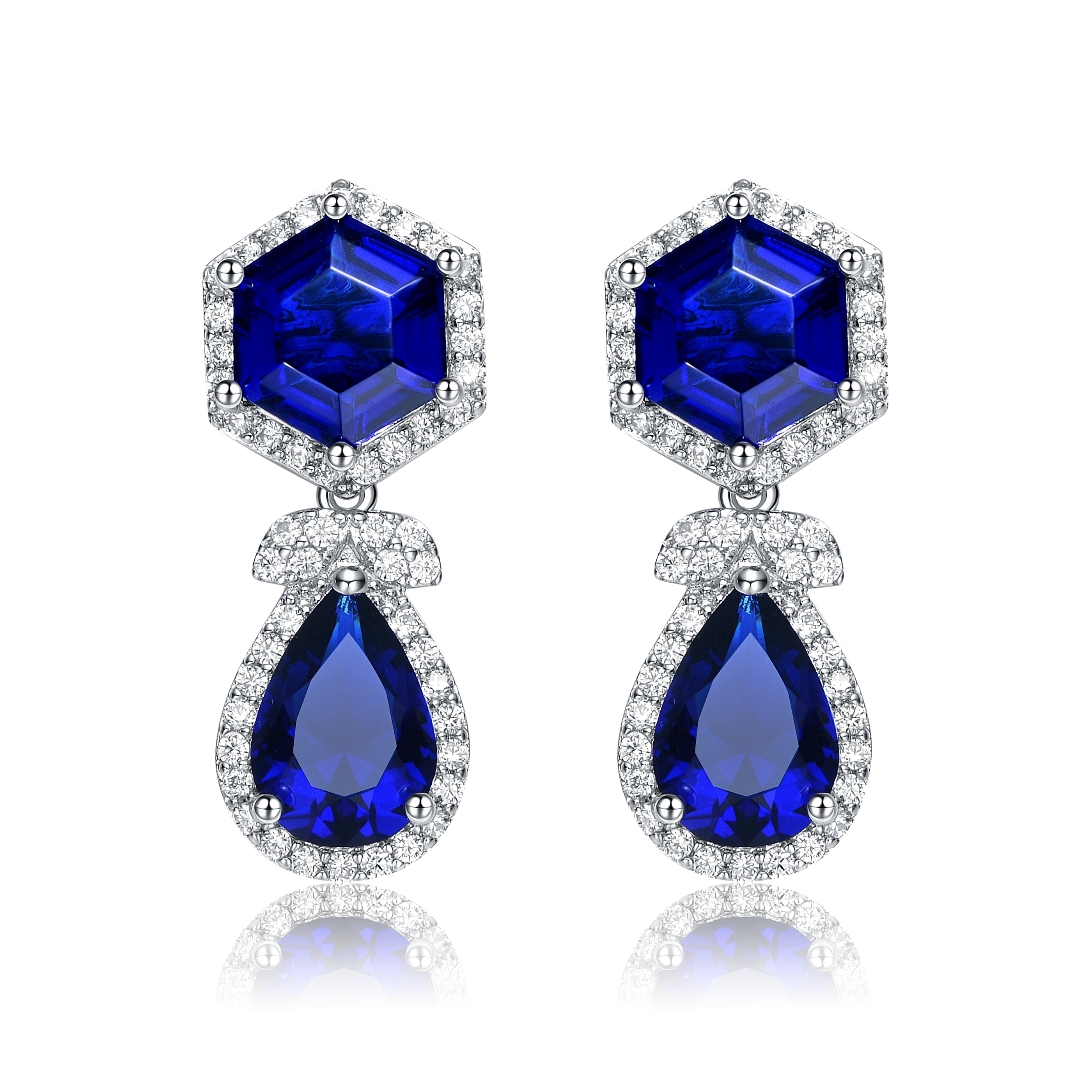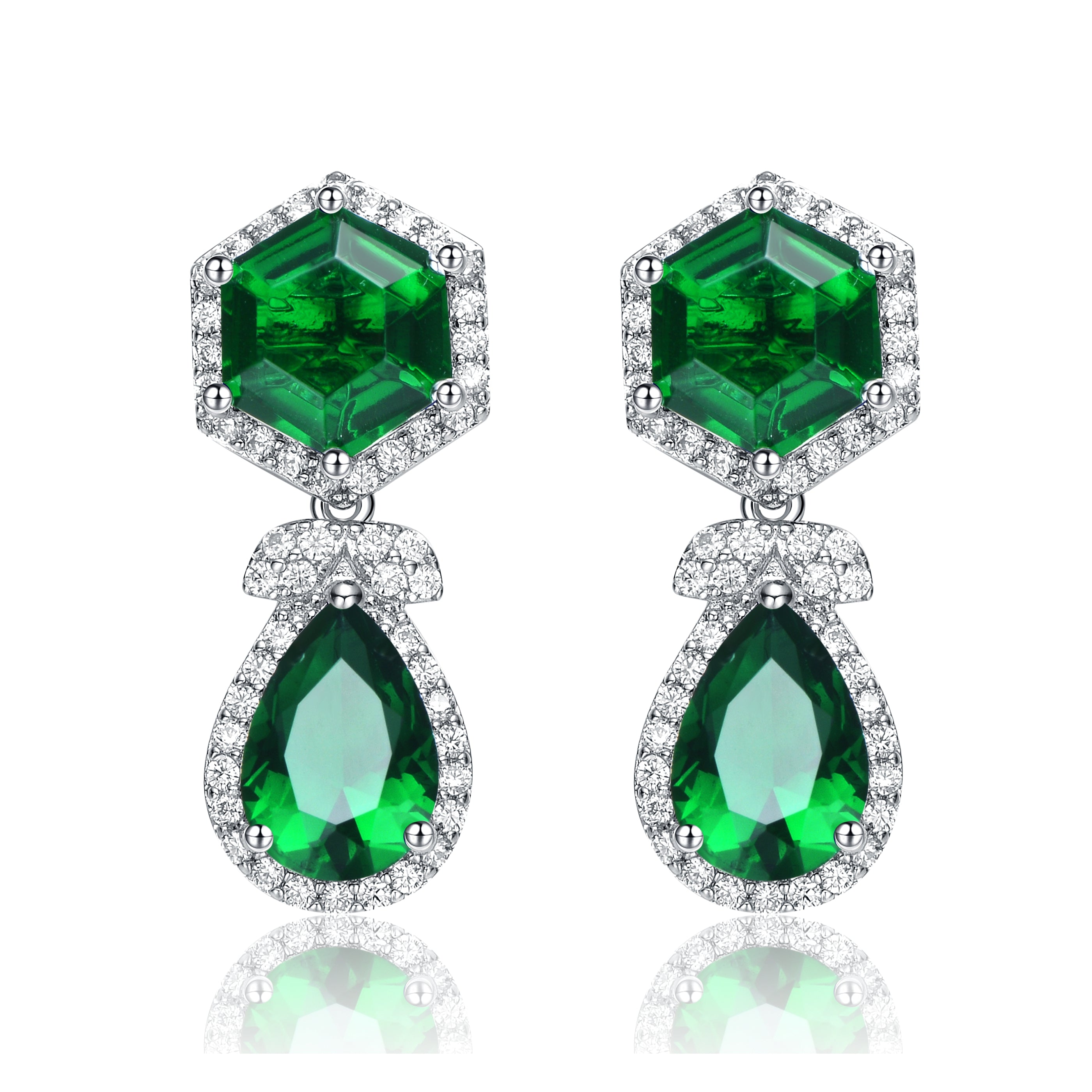 Complete your formal or semi-formal look with these elegant rhodium-plated sterling silver dangle earrings. Each pair features vibrant Sapphire or Emerald-colored cubic zirconia stones surrounded by halos of sparkling clear stones, creating a refined vintage-inspired design. Finished with butterfly backs, these earrings offer a graceful swing and timeless sparkle.