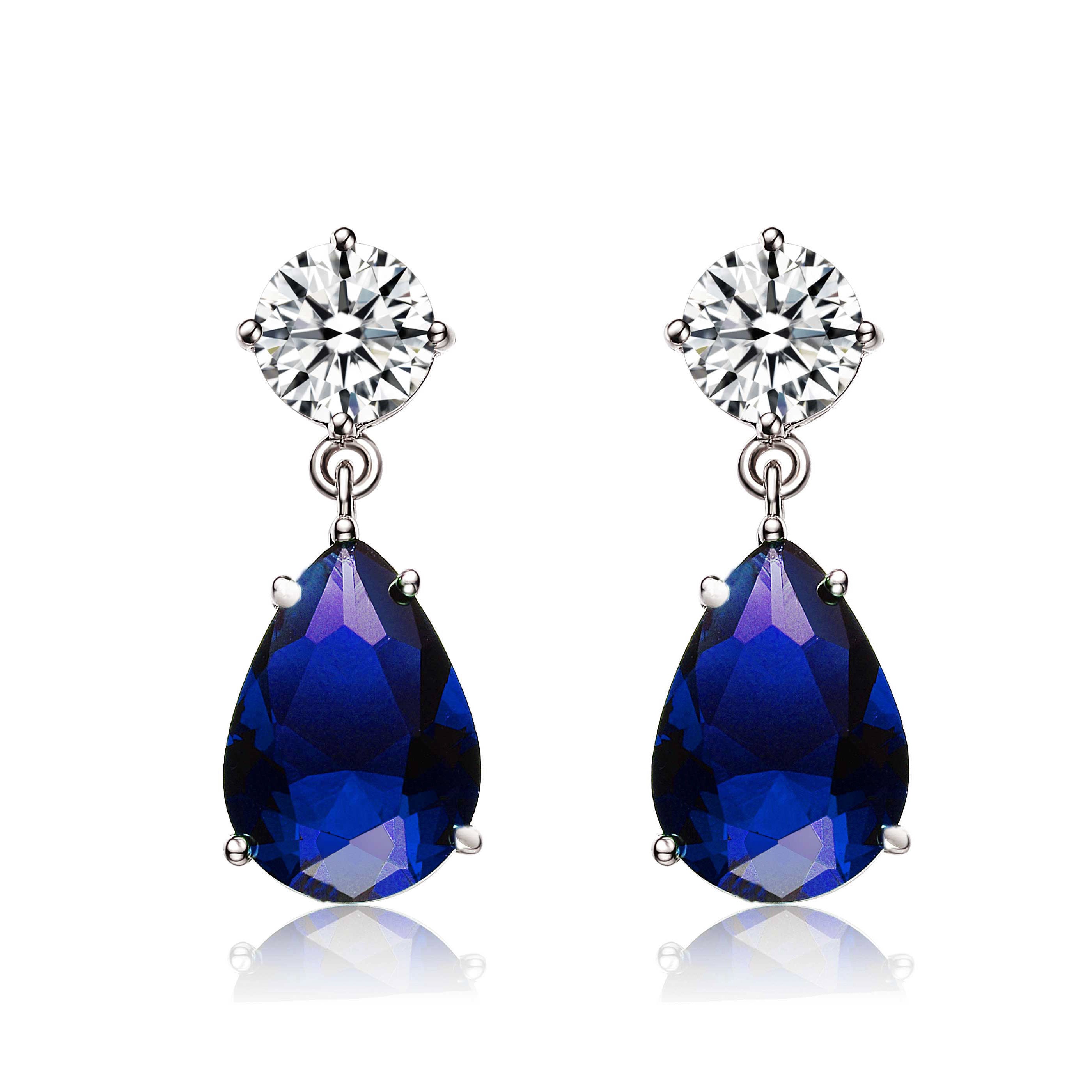 These deep blue, pear shaped cubic zirconia earrings are bewitching. The smaller, clear cubic zirconia stones create a dazzling style that is quintessential for any black-tie event.